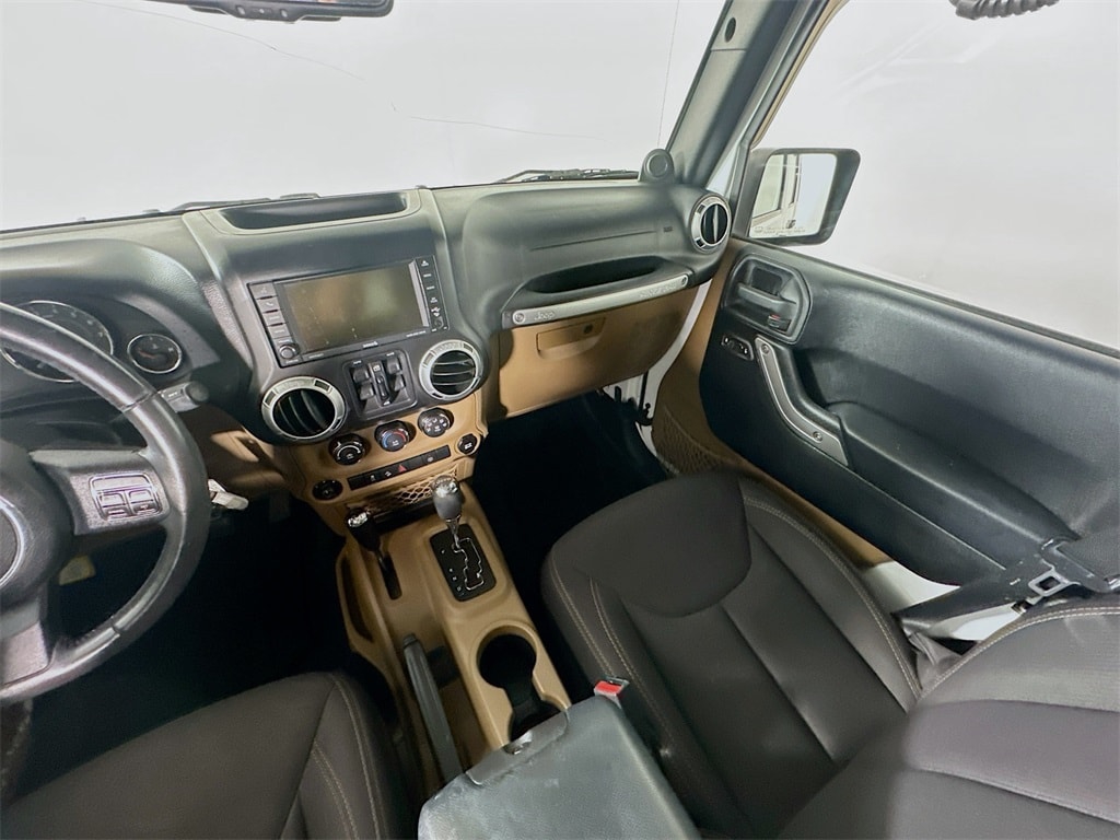 This 2013 Jeep Wrangler Sahara 4x4 in Bright White Clearcoat with Dark Saddle and black interior combines rugged capability with signature Wrangler styling and practical comfort. Powered by a 3.6 liter V6 engine paired with a five speed automatic transmission, it offers strong on road drivability and proven off road performance through its Command Trac shift on the fly four wheel drive system, next generation Dana 44 heavy duty rear axle, Dana 30 solid front axle, skid plates, trailer sway damping, hill start assist, and electronic roll mitigation. Safety features include advanced multistage front airbags, child safety rear door locks, four wheel anti lock disc brakes, stability control, and a Sentry Key theft deterrent system.