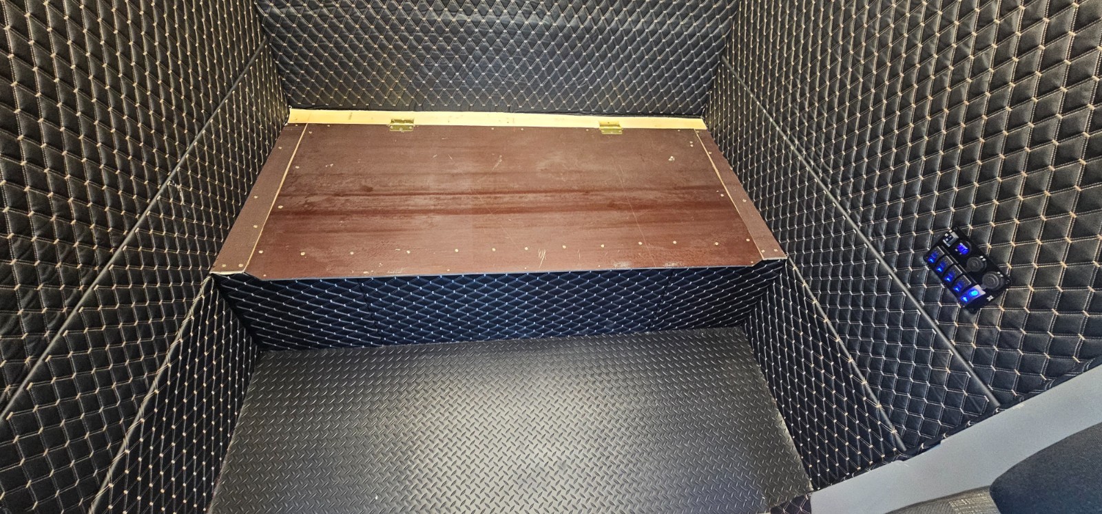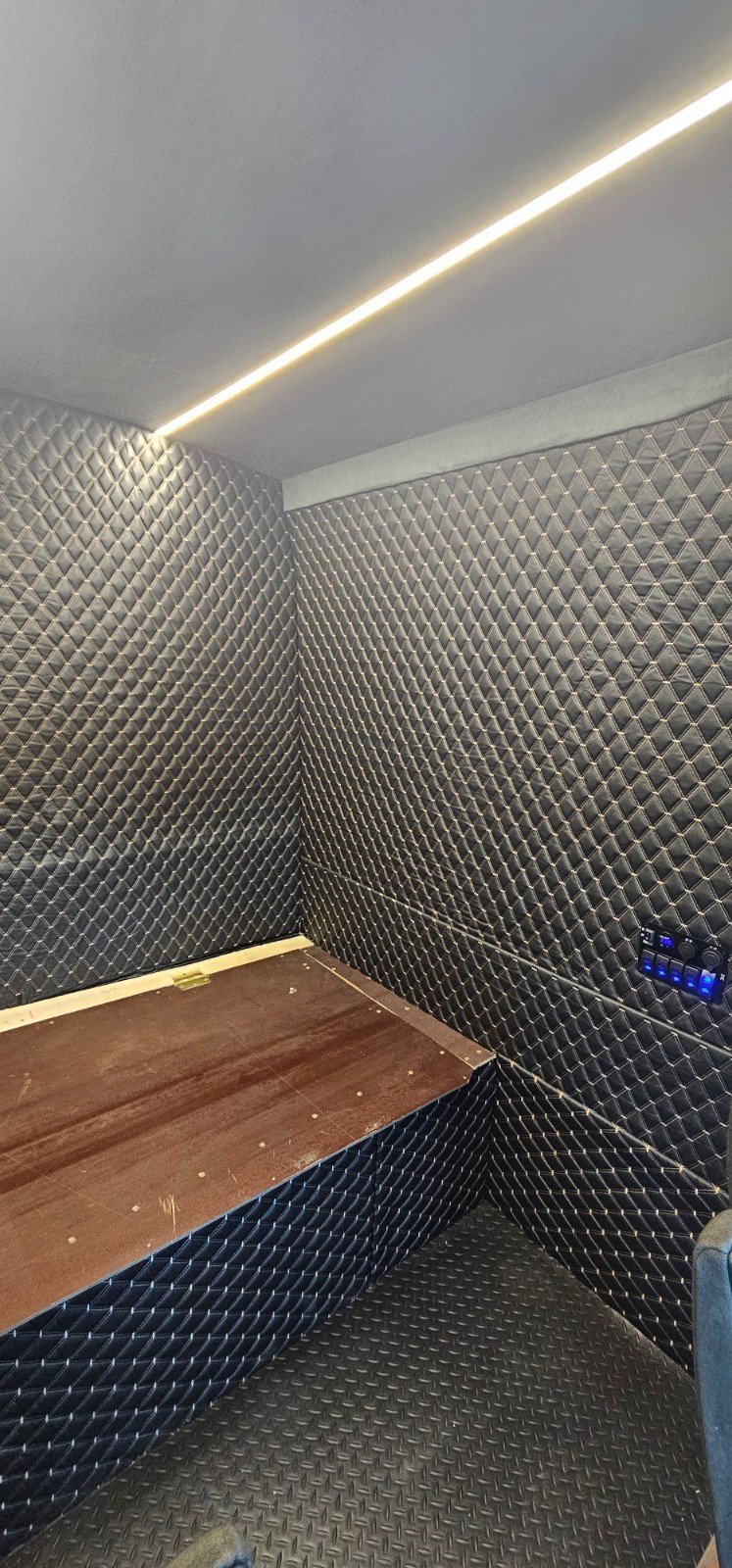 Sleeper berth is wrapped in leather & alcantara, quality trimmed, 35" bed with storage underneath, heat insulation and diesel heater for temperature control. Cab lights are connected to a 5 switch panel with a power saving mode.