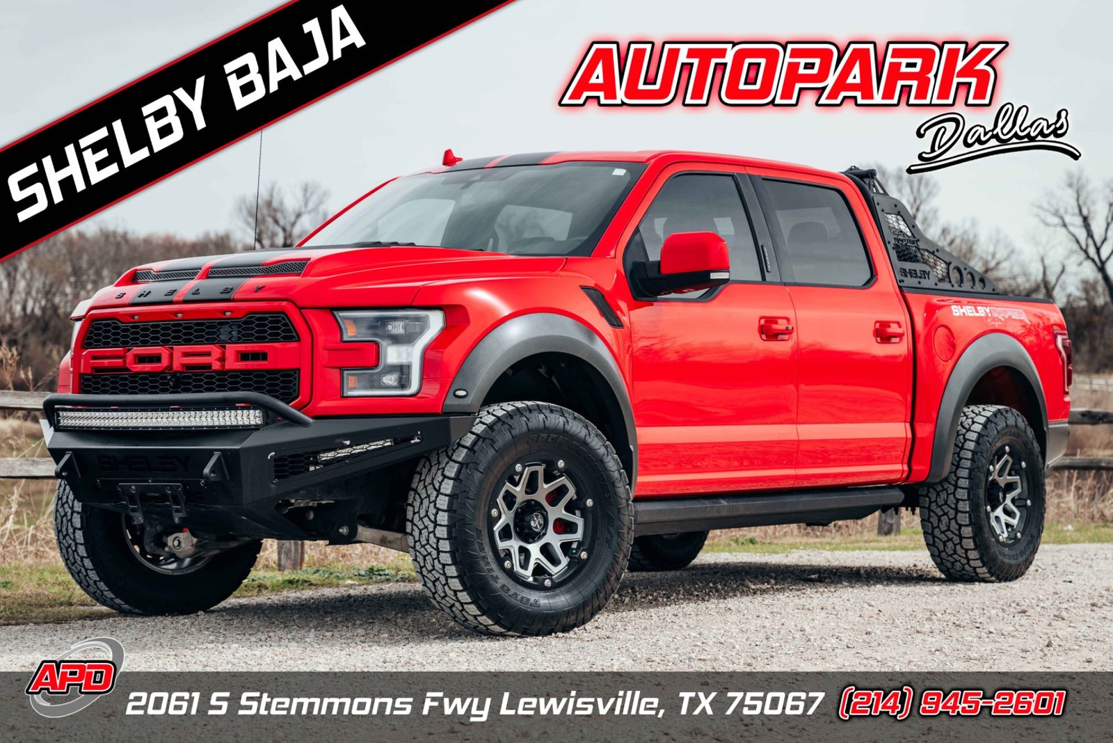 AutoPark Dallas is proud to present one of the most extreme factory-built trucks you can buy — the 2019 Ford F-150 Shelby Baja Raptor, finished in unmistakable Race Red over Black/Red interior.