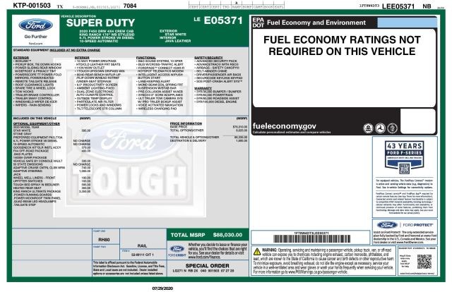 This 2020 Ford F-450 Super Duty King Ranch DRW 4x4 Crew Cab Has All the Standard Equipment 6.7L Power Stroke V8 Turbo Diesel | 10-Speed Automatic | Dual Rear Wheel 4x4 | B&O Sound System (10 speakers) | FordPass Connect 4G Wi-Fi | BLIS? with Cross-Traffic Alert | Lane-Keeping Alert | Pre-Collision Assist with AEB | 360?/Trailer Camera system with Pro Trailer Backup Assist ?and much more?