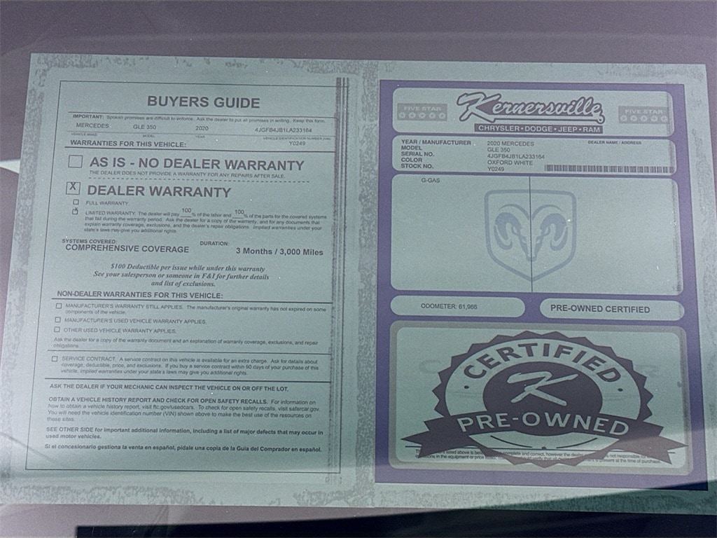 When calling or emailing, please reference stock number Y0249.MORE ABOUT THIS 2020 Mercedes-Benz GL-Class GLE 350 SUV Certified Pre Owned! One Owner! GLE 350 SUV! Premium 1 Package! Heated and ventilated front seats! Power panoramic roof! 64 color ambient lighting! Burmester surround sound system! Wide screen digital cockpit with dual displays! MBUX voice control! NFC wireless charging! Navigation with live traffic! Parking Assist Package with surround view system! Power liftgate! Illuminated running boards! Trailer hitch with increased towing capacity! LED brakelights! Rain sensing wipers! Power heated folding mirrors with turn signals! Driver monitoring alert! PRE SAFE safety system! This 2020 Mercedes Benz GLE 350 SUV in Mojave Silver Metallic with Macchiato and Magma Grey MB Tex interior delivers modern luxury, advanced technology, and everyday versatility. The Premium 1 Package enhances comfort with heated and ventilated front seats, ambient interior lighting, wireless charging, and an intuitive MBUX infotainment system displayed on dual widescreen digital panels. The panoramic roof brightens the cabin, while the Burmester surround sound system provides an immersive audio experience. Parking Assist with surround view cameras helps simplify tight maneuvers, and added conveniences such as a power liftgate, illuminated running boards, and trailer hitch make this GLE a well rounded luxury SUV for daily driving and weekend adventures. Kernersville Chrysler Dodge Jeep Ram is the LARGEST truck dealer in the Southeast for two years in a row. We have the largest selection of trucks and over 1900 vehicles in stock at all times. We aim to truly be the lowest priced in the market and we do so by price checking our inventory every day and dropping our price to remain in the TOP 3 LOWEST PRICED. Shop at the most convenient dealer in the USA, available online! Shop at Kernersville Chrysler Dodge Jeep Ram! Hablamos Espanol - llame hoy.