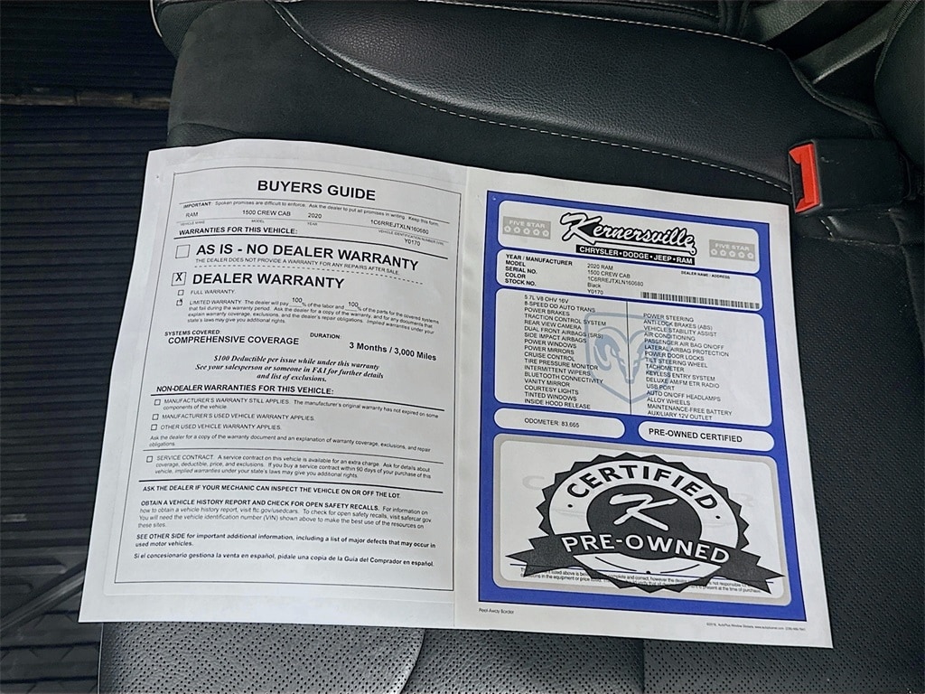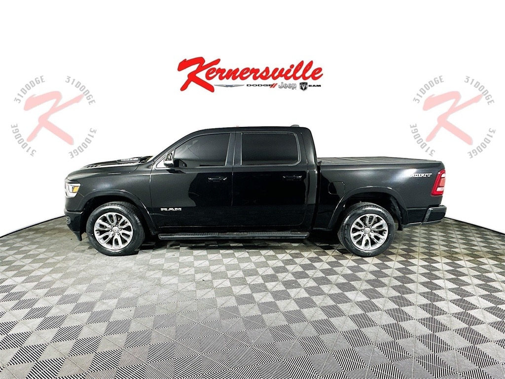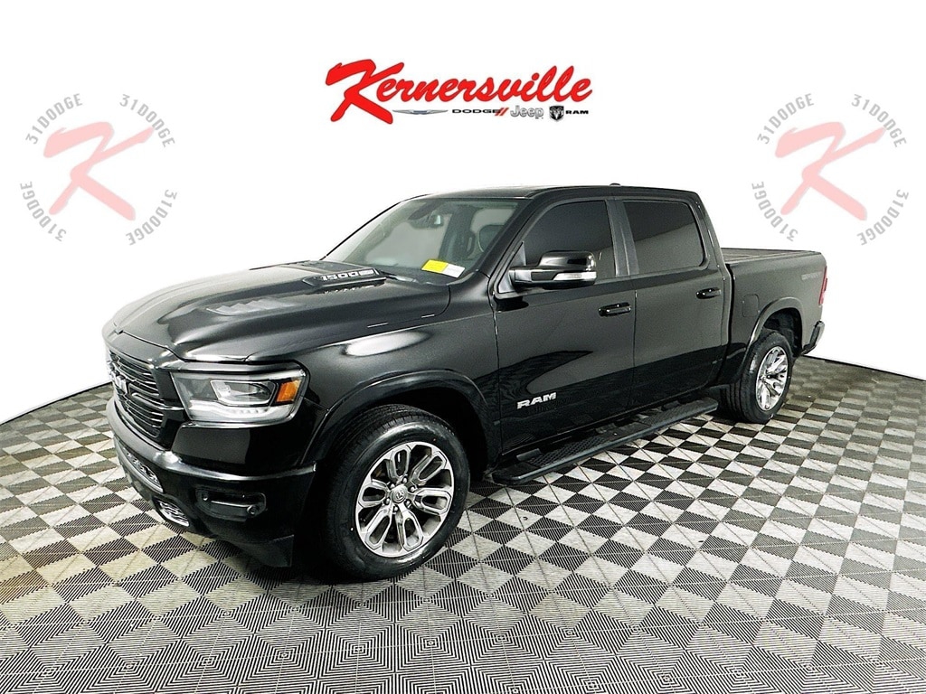 When calling or emailing, please reference stock number Y0170.MORE ABOUT THIS 2020 Ram 1500 Laramie Truck Crew Cab Certified Pre Owned! Clean Carfax! Laramie trim! 5.7L HEMI V8 engine! 8 speed automatic transmission! Sport Appearance Package! Sport Performance Hood! Multi Function tailgate! Bed Utility Group with deployable bed step, spray in bedliner, and pickup box lighting! 3.92 rear axle ratio! Anti spin rear differential! Class IV receiver hitch with 7 pin wiring! Trailer brake controller! Blind spot and cross path detection! ParkSense front and rear park assist with stop! Rain sensing wipers! Automatic high beam headlamp control! Remote start system! Leather trimmed bucket seats! Heated and ventilated front seats! Heated steering wheel! Power adjustable pedals with memory! Uconnect 8.4 inch touchscreen with navigation, Apple CarPlay, and Android Auto! 9 speaker audio system with subwoofer! This 2020 Ram 1500 Laramie Crew Cab 4x2 in Diamond Black Crystal Pearl Coat with Black leather trimmed interior blends powerful V8 performance with upscale comfort and smart towing features. The 5.7 liter HEMI V8 engine paired with the 8 speed automatic 8HP75 transmission delivers strong acceleration for highway driving and confident towing. A 3.92 rear axle ratio, anti spin rear differential, Class IV receiver hitch, 7 pin wiring harness, and integrated trailer brake controller provide the hardware needed for trailers and toys, while trailer sway damping, ready alert braking, rain brake support, tire fill alert, and electronic stability systems help enhance control. Inside, the Laramie cabin focuses on comfort and technology with leather trimmed bucket seats, heated and ventilated front seats, heated steering wheel, dual zone automatic temperature control, power adjustable pedals with memory, and 8 way power driver and passenger seats. The Uconnect system with 8.4 inch touchscreen and navigation offers Apple CarPlay, Android Auto, Bluetooth voice command, a full function media hub with multiple USB ports, and a 9 speaker audio system with subwoofer for rich sound. A 7 inch color driver information display, remote proximity keyless entry, and push button start add everyday convenience. Exterior highlights include the Sport Appearance Package with body color grille surround and black accents, Sport Performance Hood, spray in bedliner, deployable bed step, adjustable cargo tie down hooks, pickup box lighting, dampened and remote release tailgate, polished wheels, and bold Laramie styling. Safety is supported by advanced multistage airbags, supplemental side curtain and front seat airbags, ParkView rear backup camera, ParkSense front and rear park assist with stop, blind spot monitoring with cross path detection, and rain sensing windshield wipers. This Laramie Crew Cab 4x2 delivers a refined mix of power, luxury, and utility for truck shoppers. Kernersville Chrysler Dodge Jeep Ram is the LARGEST truck dealer in the Southeast for two years in a row. We have the largest selection of trucks and over 1900 vehicles in stock at all times. We aim to truly be the lowest priced in the market and we do so by price checking our inventory every day and dropping our price to remain in the TOP 3 LOWEST PRICED. Shop at the most convenient dealer in the USA, available online! Shop at Kernersville Chrysler Dodge Jeep Ram! Hablamos Espanol - llame hoy.
