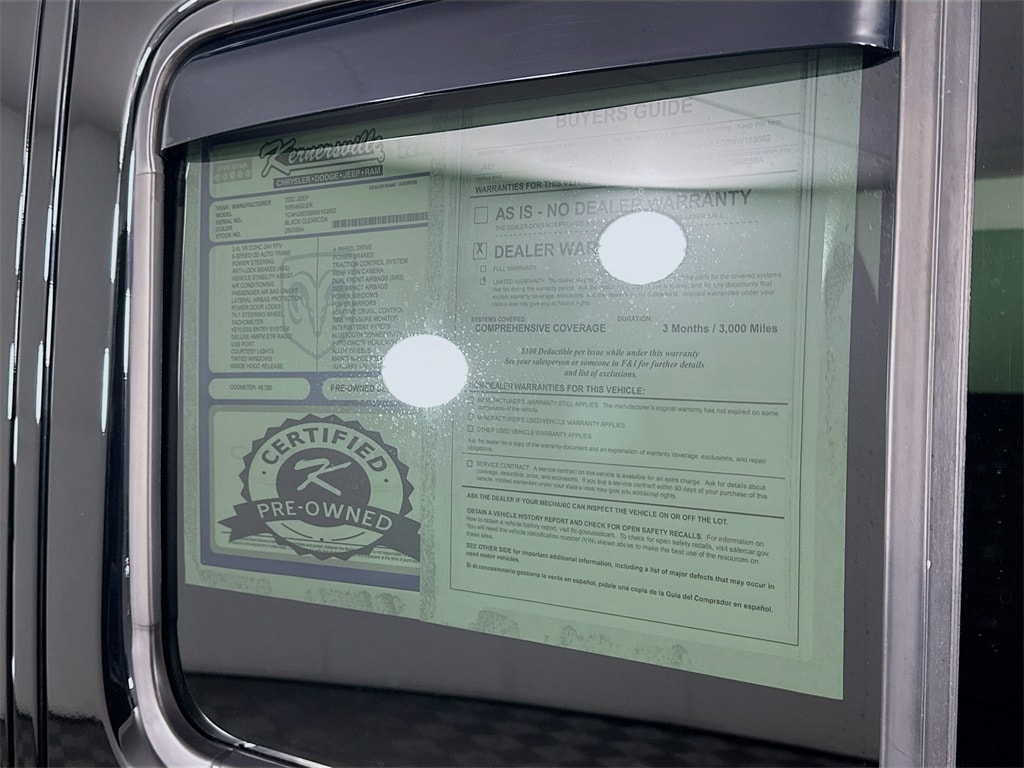 When calling or emailing, please reference stock number 260556A.MORE ABOUT THIS 2022 Jeep Wrangler Unlimited Sahara Sport Utility Certified Pre Owned! Clean Carfax! One Owner! Wrangler Unlimited Sahara 4X4! 3.6L V6 Engine! 8 Speed Automatic Transmission! Command-Trac Part-Time 4WD System! ParkView Rear Backup Camera! Remote Keyless Entry! Security Alarm! Universal Garage Door Opener! Apple CarPlay! Android Auto! Integrated Voice Command with Bluetooth! Uconnect Touchscreen Display! Automatic Climate Control! Power Front Windows with One Touch Down! Leather Wrapped Steering Wheel! Steering Wheel Mounted Audio Controls! Heated Front Seats! Heated Steering Wheel! Remote Start System! Rear 60/40 Folding Seat! Automatic Headlamps! Front Fog Lamps! Power Heated Mirrors! Side Steps! This 2022 Jeep Wrangler Unlimited Sahara 4X4 delivers iconic Jeep capability with refined comfort and modern technology, powered by a strong 3.6L V6 engine paired to a smooth 8 speed automatic transmission and the Command-Trac part-time 4WD system for confident performance on and off the road. Safety and convenience features include a rear backup camera, remote keyless entry, security alarm, and universal garage door opener for everyday ease. Inside, the cabin is equipped with a Uconnect touchscreen display featuring Apple CarPlay, Android Auto, Bluetooth connectivity, and integrated voice command, along with automatic climate control, power windows, a leather wrapped steering wheel, and steering wheel mounted audio controls. Comfort is enhanced with heated front seats, a heated steering wheel, remote start, and a versatile rear 60/40 folding seat. Exterior highlights include automatic headlamps, front fog lamps, power heated mirrors, and side steps, making this Wrangler Unlimited Sahara a well-rounded SUV built for adventure, comfort, and daily driving. Kernersville Chrysler Dodge Jeep Ram is the LARGEST truck dealer in the Southeast for two years in a row. We have the largest selection of trucks and over 1900 vehicles in stock at all times. We aim to truly be the lowest priced in the market and we do so by price checking our inventory every day and dropping our price to remain in the TOP 3 LOWEST PRICED. Shop at the most convenient dealer in the USA, available online! Shop at Kernersville Chrysler Dodge Jeep Ram! Hablamos Espanol - llame hoy.