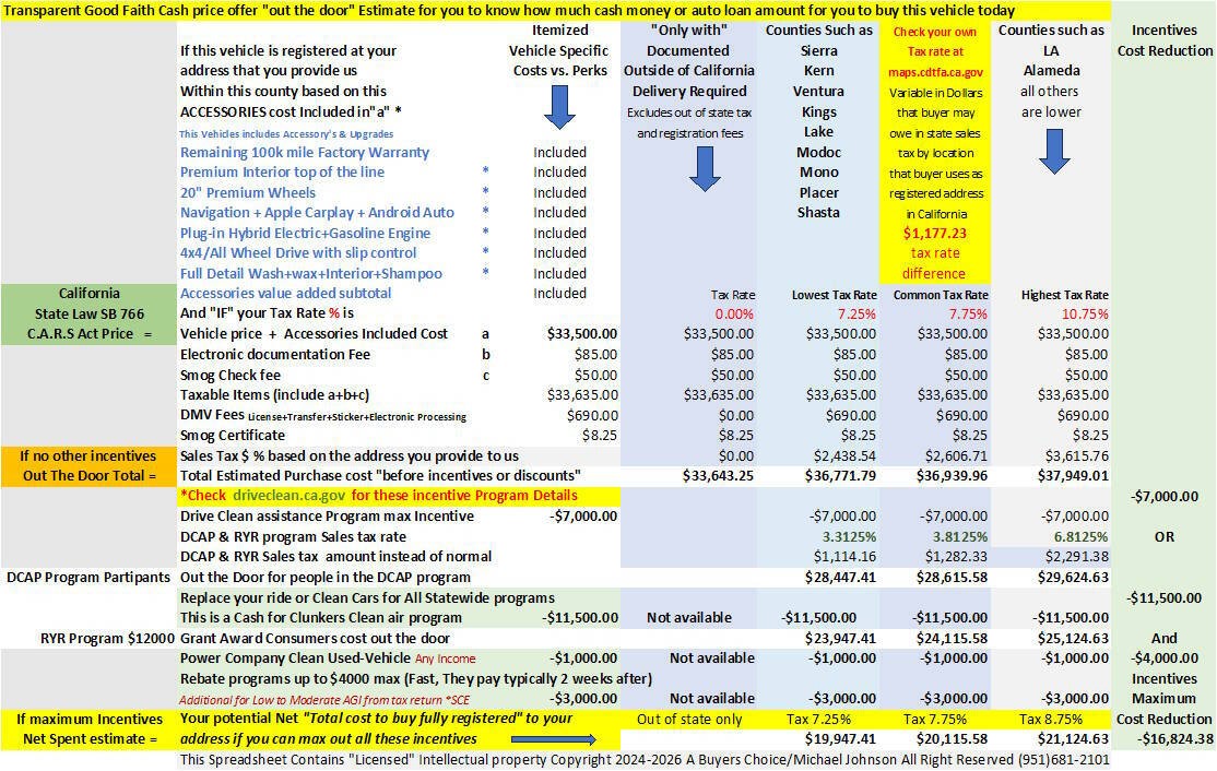 All Buyers should call the seller between 9am-7pm pacific time to ask for a Good Faith out the door cost Estimate of any and all fees based on the exact intended purchase amount and delivery intended.