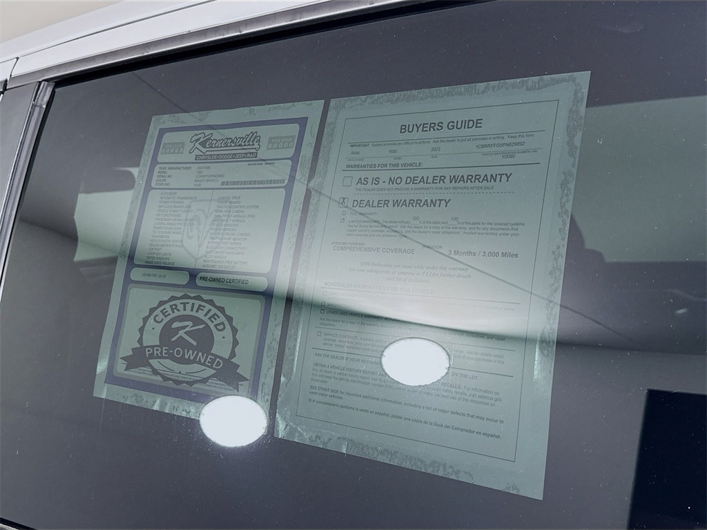 When calling or emailing, please reference stock number Y0090.MORE ABOUT THIS 2023 Ram 1500 Big Horn/Lone Star Truck Crew Cab Certified Pre-Owned! Backup Camera! This Clean CarFax 2023 RAM 1500 BIG HORN 4WD Crew cab truck has a 3.6L V6 24V VVT engine, automatic transmission, cloth seats, Certified Pre-Owned, rear-view camera, push start, remote start, steering wheel controls, auxiliary input, USB port, Bluetooth, cruise control, keyless entry, and 29,147 miles. It is also equipped with 33x12.50R20LT Tires, Automatic Headlamps, Halogen Quad Headlamps, Rear FixedWindow, 6 Speakers, Uconnect 3 with 5Inch Touch Screen Display, HillStart Assist, and Sentry Key TheftDeterrent System. About Kernersville Chrysler Dodge Jeep Ram Kernersville Chrysler Dodge Jeep Ram is the LARGEST truck dealer in the Southeast for two years in a row. We have the largest selection of trucks and over 1900 vehicles in stock at all times. We aim to truly be the lowest priced in the market and we do so by price checking our inventory every day and dropping our price to remain in the TOP 3 LOWEST PRICED. Shop at the most convenient dealer in the USA, available online! Shop at Kernersville Chrysler Dodge Jeep Ram! Hablamos Espanol - llame hoy.