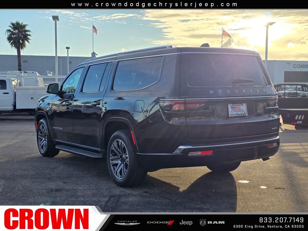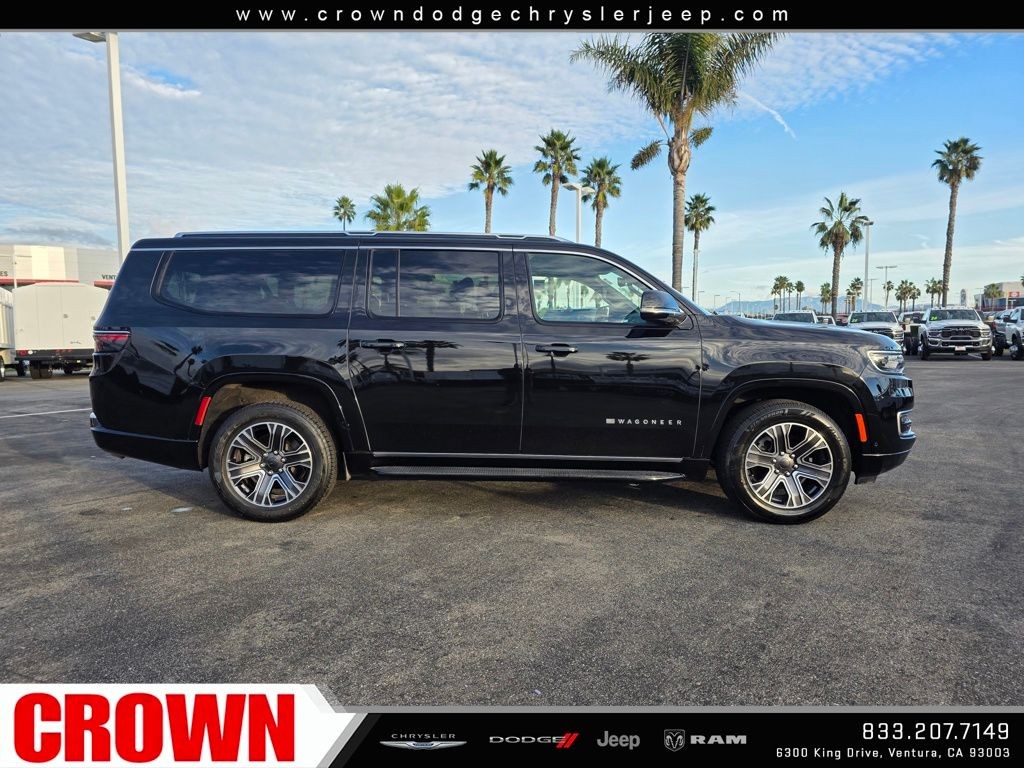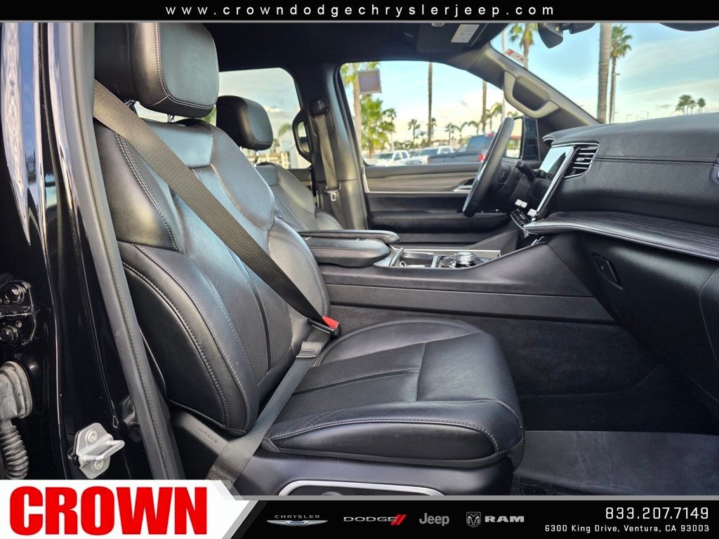 Diamond Black Crystal Pearlcoat 2024 Jeep Wagoneer L Series II RWD 8-Speed Automatic 3.0L I6 10 Speakers, 3rd row seats: bench, 7-Passenger Seating, Adjustable pedals, AM/FM radio: SiriusXM with 360L, Apple CarPlay/Android Auto, Auto-dimming door mirrors, Auto-dimming Rear-View mirror, Auto-leveling suspension, Automatic temperature control, Compass, Emergency communication system: Wagoneer Connect, Exterior Parking Camera Rear, Flexible Seating Group, Floor Console w/Cupholder, Front dual zone A/C, Front fog lights, Fully automatic headlights, Garage door transmitter, Genuine wood console insert, Genuine wood dashboard insert, Genuine wood door panel insert, Heated door mirrors, Heated front seats, Heated steering wheel, Illuminated entry, Leather Trimmed Bucket Seats, Memory seat, Navigation System, Outside temperature display, Overhead console, Pedal memory, Power door mirrors, Power driver seat, Power Liftgate, Power passenger seat, Power Tip/Slide Recline 2nd Row Buckets, Quick Order Package 25J, Radio: Uconnect 5 Nav w/10.1 Display, Rear air conditioning, Rear window defroster, Reclining 3rd row seat, Remote keyless entry, Security system, Speed control, Speed-sensing steering, Split folding rear seat, Steering wheel memory, Steering wheel mounted audio controls, Turn signal indicator mirrors, Ventilated front seats, Wheels: 20 x 9.0 Premium 2 Aluminum.