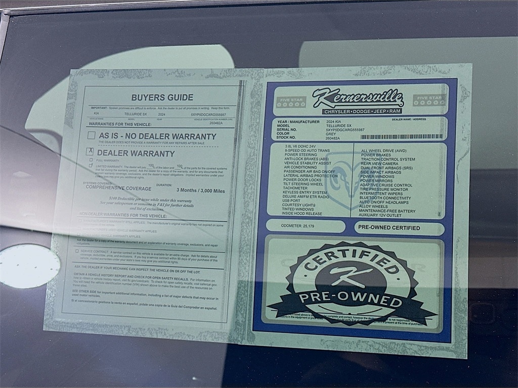 When calling or emailing, please reference stock number 260482A.MORE ABOUT THIS 2024 Kia Telluride SX-Prestige X-Pro SUV Certified Pre Owned! Clean Carfax! One Owner! SX Prestige X Pro Trim! All Wheel Drive! V6 Engine! 8 Speed Automatic Transmission! Highway Driving Assist 2! Forward Collision Avoidance With Cross Traffic And Left Turn Assist! Blind Spot Monitoring With Collision Avoidance! Surround View Camera System! Front And Rear Parking Sensors! Rear View Backup Camera! Adaptive Cruise Control! Driver Monitoring Alert! Remote Smart Key With Push Button Start! Power Liftgate! Roof Rails! LED Projector Headlamps With Automatic High Beams! Front Fog Lamps! Heated And Ventilated Front Seats! Premium Nappa Leather Seating! Heated Steering Wheel! Dual Zone Automatic Climate Control! Large Touchscreen Display! Integrated Navigation! Apple CarPlay! Android Auto! Bluetooth Hands Free Calling! Harman Kardon Premium Audio System! Multiple USB Power Ports! This 2024 Kia Telluride SX Prestige X Pro AWD is a top tier midsize SUV that blends rugged capability, advanced safety technology, and luxury level comfort for families and adventure focused drivers. Powered by a strong V6 engine paired with an 8 speed automatic transmission and confident all wheel drive, this Telluride delivers smooth performance, confident traction, and a refined ride for daily driving or long road trips. Advanced driver assistance features include highway driving assist 2, forward collision avoidance with cross traffic and left turn assist, blind spot collision avoidance, driver monitoring alert, adaptive cruise control, surround view camera system, front and rear parking sensors, and a rear view backup camera to enhance awareness in all conditions. The interior offers a premium experience with Nappa leather seating, heated and ventilated front seats, a heated steering wheel, dual zone automatic climate control, and a quiet upscale cabin designed for comfort. Technology highlights include a large touchscreen infotainment system with built in navigation, Apple CarPlay, Android Auto, Bluetooth connectivity, a Harman Kardon premium audio system, and multiple USB charging ports throughout the cabin. Exterior features include LED lighting, fog lamps, roof rails, a power liftgate, and distinctive X Pro styling that adds a rugged yet refined presence. With its Certified Pre Owned status, Clean Carfax history, and One Owner background, this Telluride SX Prestige X Pro is an exceptional choice for drivers seeking luxury, safety, and versatility in a modern SUV. Kernersville Chrysler Dodge Jeep Ram is the LARGEST truck dealer in the Southeast for two years in a row. We have the largest selection of trucks and over 1900 vehicles in stock at all times. We aim to truly be the lowest priced in the market and we do so by price checking our inventory every day and dropping our price to remain in the TOP 3 LOWEST PRICED. Shop at the most convenient dealer in the USA, available online! Shop at Kernersville Chrysler Dodge Jeep Ram! Hablamos Espanol - llame hoy.