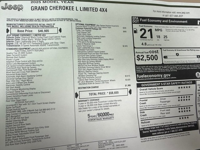 $775 P/MO, $200 DOWN, 84 MONTHS, 6.99% APR (WITH APPROVED CREDIT).* ALL DEALER FEES ARE INCLUDED IN OUR PRICE! This is a new 2025 Jeep Grand Cherokee L Limited 4WD. It comes with the 3 year - 36,000 mile Factory Bumper to Bumper Warranty as well as a 5 year - 60,000 Factory Powertrain Warranty. It is equipped with a 3.6L V6 24V VVT Engine with Stop/Start, 8-Speed Automatic Transmission, Quadra-Trac I 4WD System, Selec-Terrain System, Remote-Start System, Power Liftgate, Adaptive Cruise Control with Stop and Go, Active Lane-Management System, Full-Speed Forward Collision Warning Plus, ParkView Rear Back-Up Camera, ParkSense Rear Park-Assist with Stop, Blind-Spot and Cross-Path Detection, Advanced Brake-Assist, Auto High-Beam Headlamp Control, Universal Garage Door Opener, Anti-Lock 4-Wheel Disc Brakes, Hill Start Assist, Tire Pressure Monitoring Display, Conventional Differential Front Axle with Disconnect, Speed-Sensitive Power Door Locks, Power Windows, Power Heated Mirrors, UConnect 5 Nav with 10.1-Inch Touch Screen Display, Apple CarPlay, Google Android Auto, SiriusXm 360L with 3-Month Sub Call 800-643-2112, Jeep Connect (Connected Services) with Trial, GPS Navigation, 4G LTE Wi-Fi Hotspot, Heated Steering Wheel, Heated Front Seats, Heated 2nd-Row Seats, 6 Premium Speakers, 2nd-Row Buckets with Manual Easy-Entry Slide, 3rd-Row 50/50 Manual Folding Seat, 8-Way Power Adjustable Driver and Front Passenger Seat, Driver Seat Memory, A/C with 3-Zone Auto Temperature Control, 2nd-Row Dual Charge-Only USB Ports, Trailer-Tow Package, Dual Exhaust Tips, Trailer-Hitch Zoom, Automatic Headlamp Leveling System, Rear Load-Leveling Suspension, Full-Size Spare Tire, 7-Pin and 4-Pin Wiring Harness, Luxury Tech Group II, Capri Leatherette Axis II Seats, Ventilated Front Seats, Intersection Collision-Assist System, ParkSense Front and Rear Park-Assist, Surround-View Camera System, Rain-Sensitive Windshield Wipers, Rear-View Auto-Dimming Digital Display Mirror, Rear Back-Up Camera Washer, Integrated Off-Road Camera, Manual 2nd-Row Window Shades, Auto-Dimming Exterior Driver Mirror, Door and Liftgate Passive Entry, Memory Steering Column, Power Tilt/Telescope Steering Column, Wireless Charging Pad, Dual-Pane Panoramic Sunroof, Interior Rear-Facing Camera, 20-Inch x 8.5-Inch Machined/Painted Aluminum Wheels, 265/50R20 BSW All-Season LRR Tires, and Customer Preferred Package 22E. The MSRP on this 2025 Jeep Grand Cherokee L Limited 4WD is $58,655. Our Internet and E-Bay pricing include rebates/incentives. You may qualify for additional rebate or discount. Please contact our sales department for details. *Financing: Sample payments are based on approved credit. Finance rates are available through Ally Bank or TD Bank. The price or payment does not include sales tax/tag, this is due to each state having a different sales tax rate. *A.P.R. - Annual Percentage Rate - The annual rate that is charged for borrowing, expressed as a number that expresses the yearly cost for the term of the loan. Click here for more information - www.consumerfinance.gov