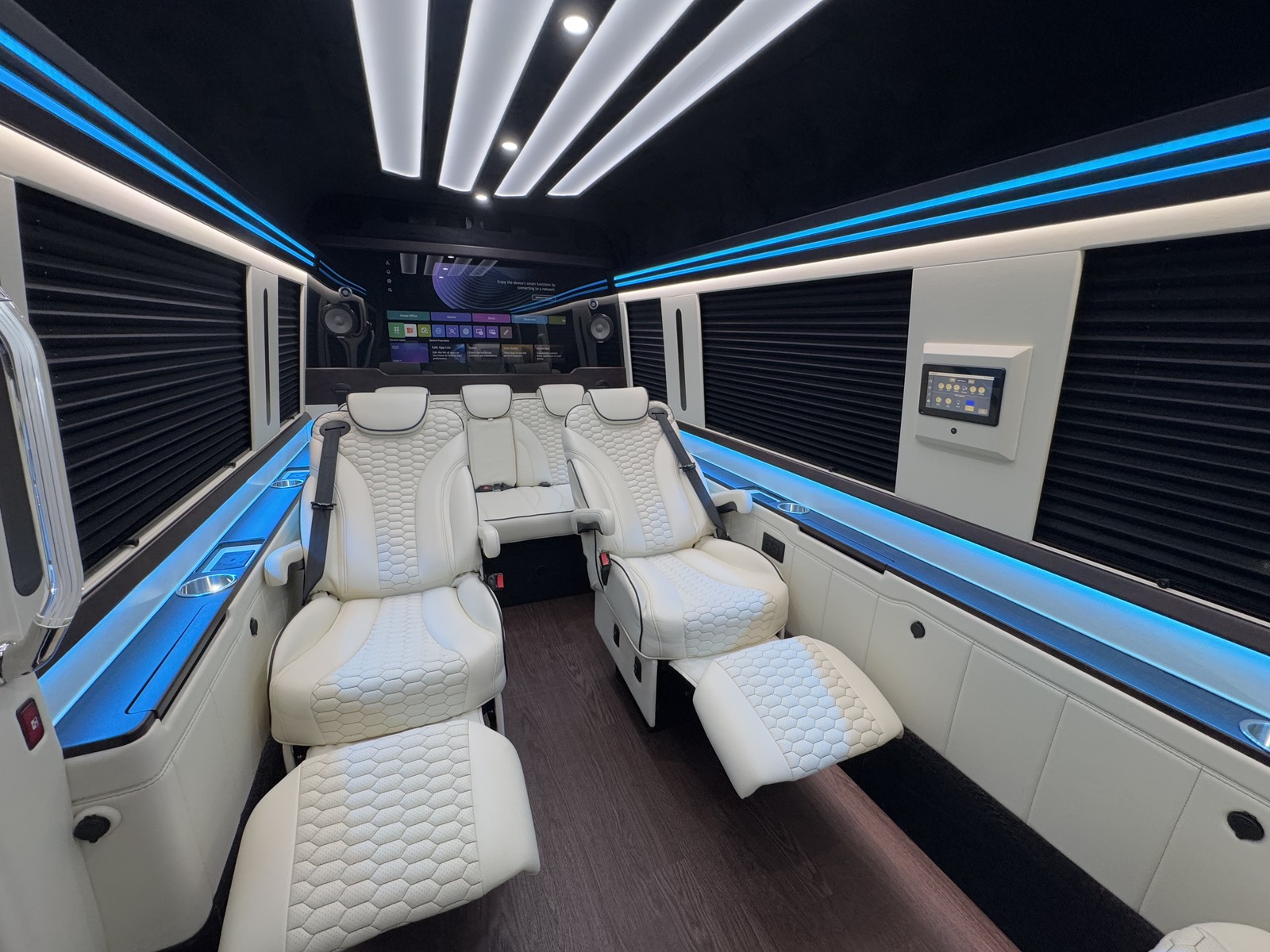 From touch screen controls, LED lighting, high line audio components, to motorized fold out desks and Apple TV, we love to build user friendly features into every custom luxury vehicle! Our staff is always researching new and improved technologies for lighting, entertainment, mobile office solutions, and overall comfort.