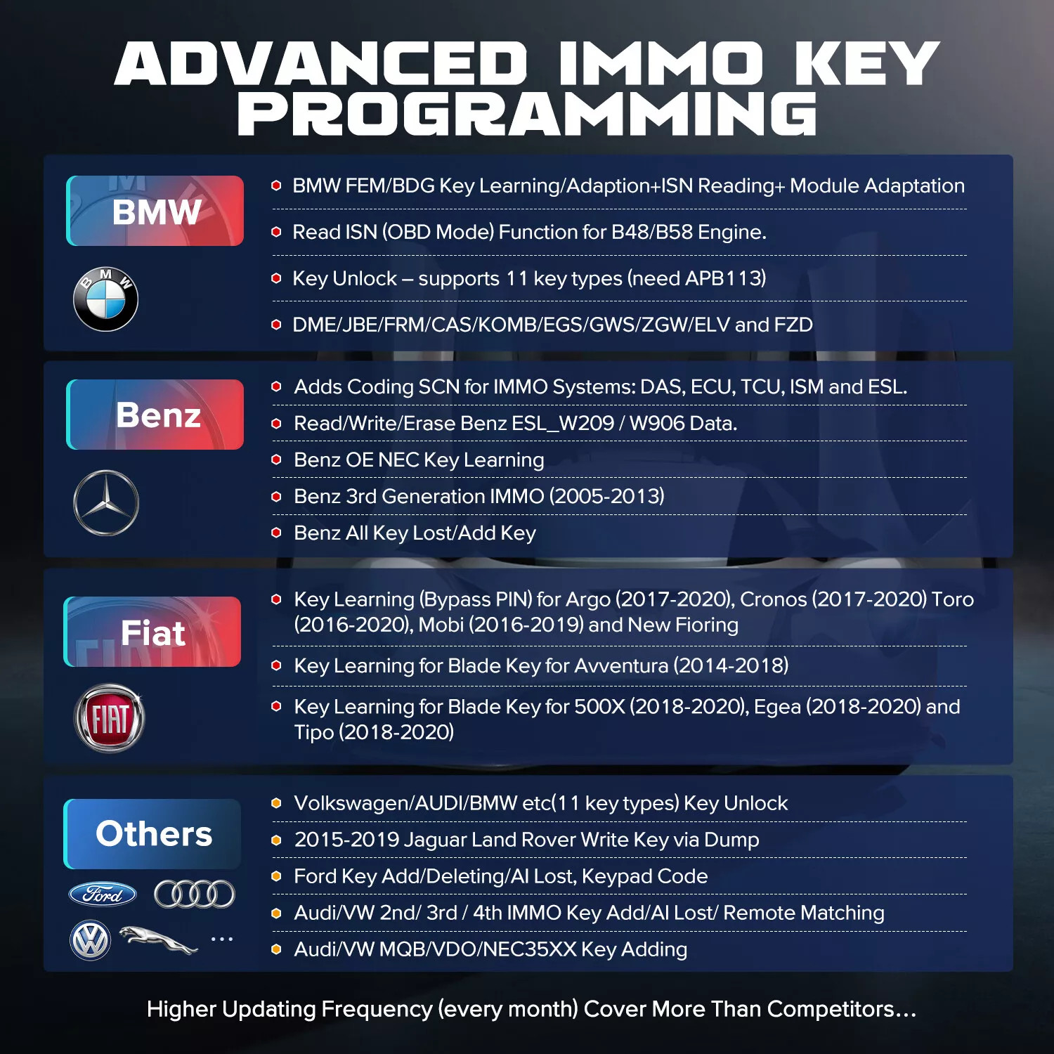 4. Highlights IMMO Functions of IM608S II: Key programming for Benz 3rd Generation EIS all models; key programming for BMW EWS4-FEM/BDC all models (except for G chassis); Write key via dump for year 2015+(Land Rover/Jaguar); Support all models and add key all key lost before the year 2019 (Volvo).