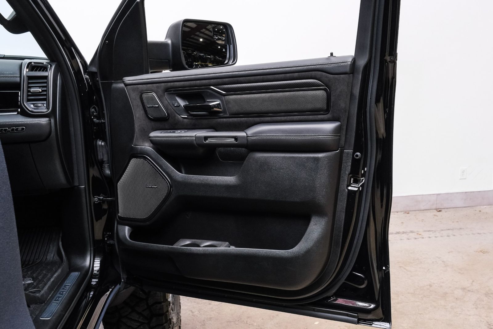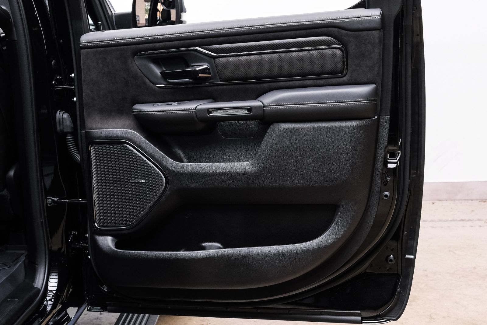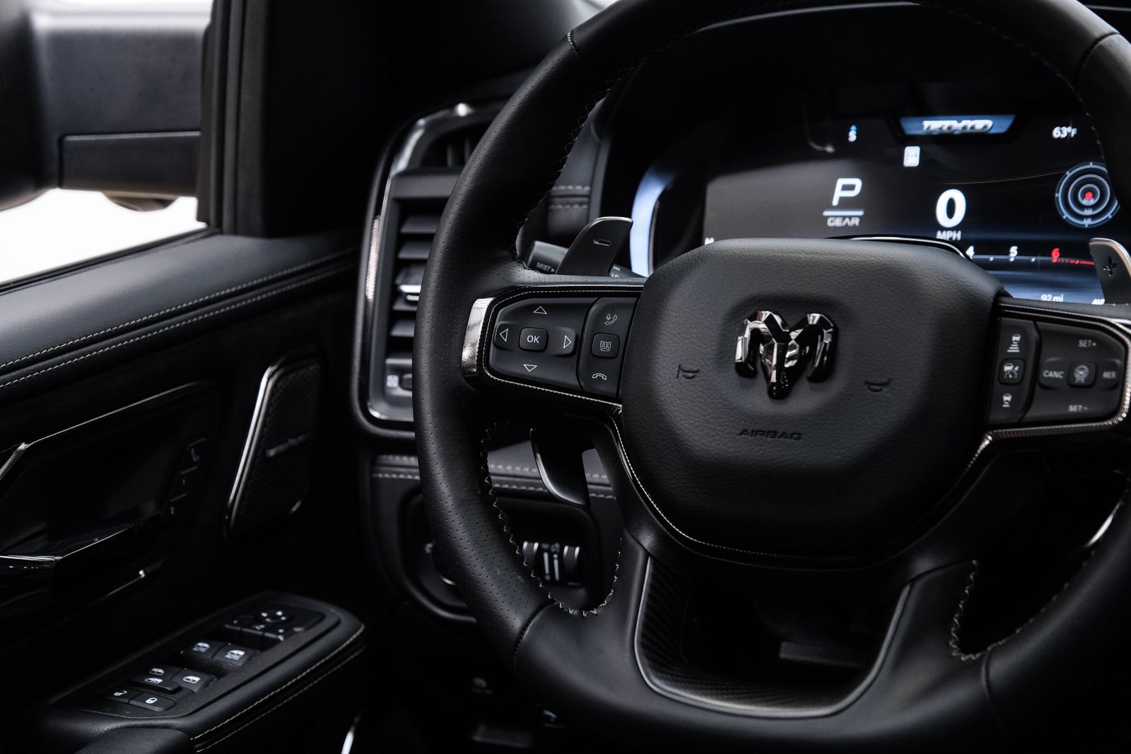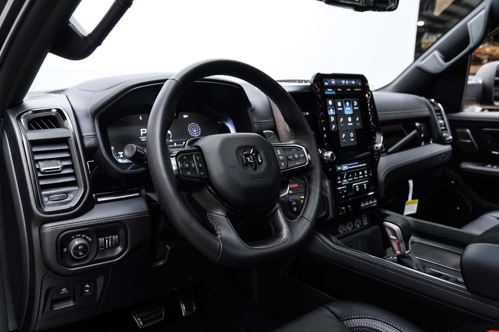 Includes UConnect with 14.4 inch touch screen display, Apple Carplay, Android Auto, AM/FM radio, HD radio, integrated voice command with Bluetooth, media hub with USB and auxiliary audio inputs, GPS navigation, SiriusXM 360L satellite radio with Traffic Plus, Travel Link, 4G Harman Kardon 19 speaker audio system with 900 watts, LTE Wi-Fi hotspot, wireless charging pad, 10.25 inch front passenger interactive display, smartphone as a key capable, front ventilated and massaging seats, recline 60/40 split folding seat, rear heated seats, full length premium upgraded floor console, leather/carbon flat-bottom steering wheel, real carbon fiber interior accents, luxury front door panel trim, wrapped driver and passenger assist handles, power adjustable pedals, 2-driver memory for driver seat, radio, exterior mirrors, and pedals, rain-sensitive windshield wipers, hands-free active driving assist, evasive steering assist, intersection collision assist system, drowsy driver detection, traffic sign recognition, head-up display, rearview auto-dimming digital display mirror, surround vision camera system, LED CHMSL lamp, power open/close tailgate, 12-pin trailer connector, and 240 amp alternator.