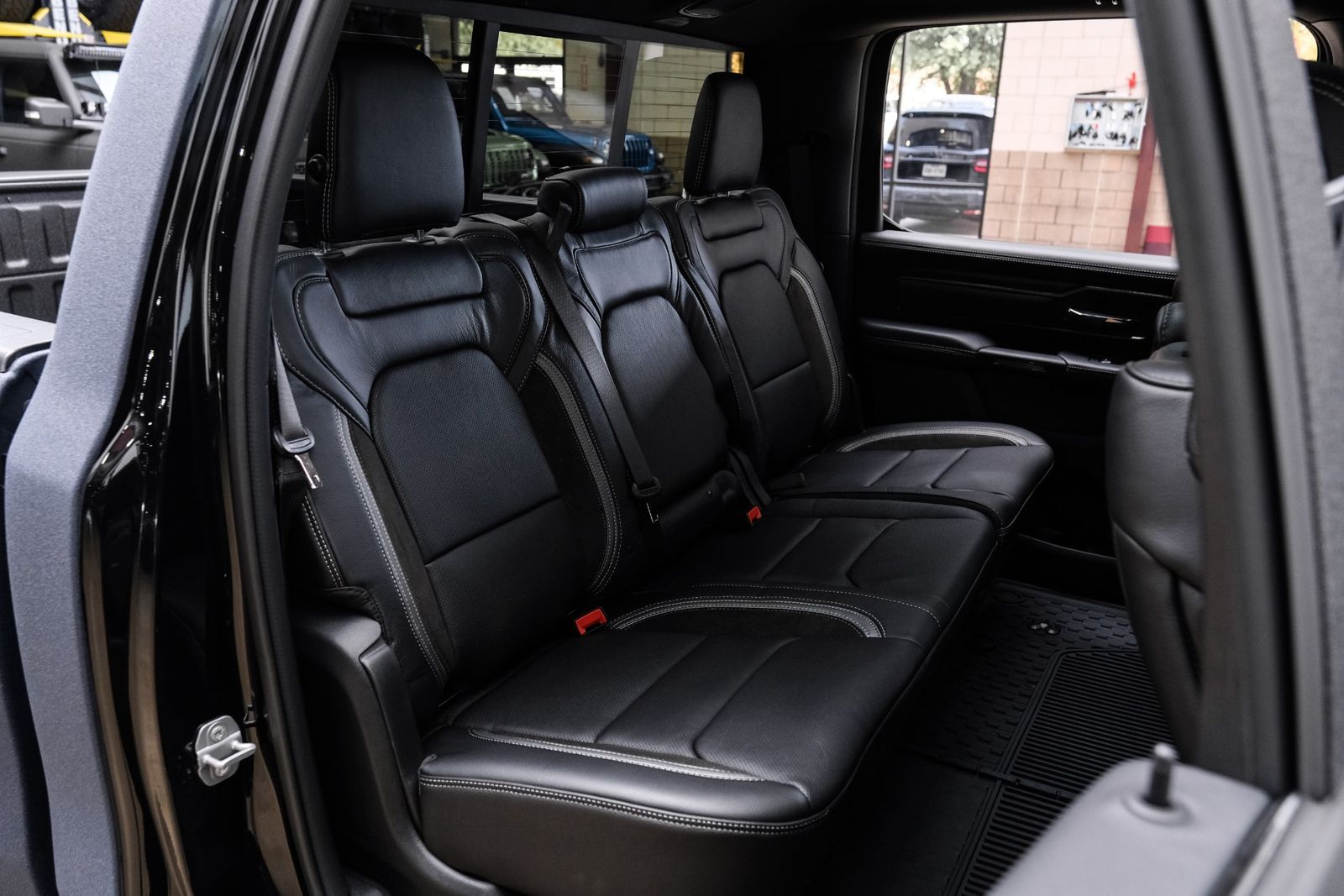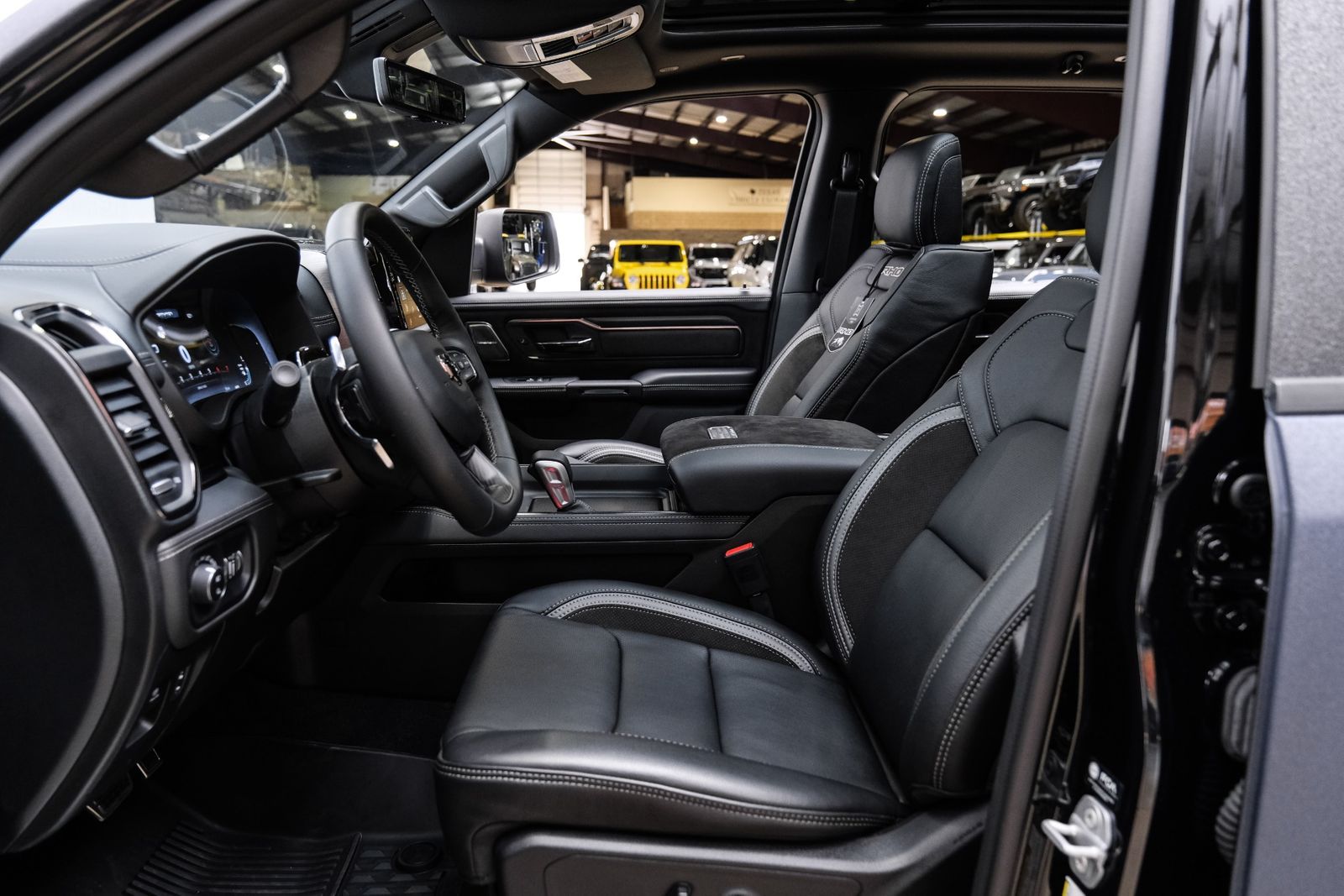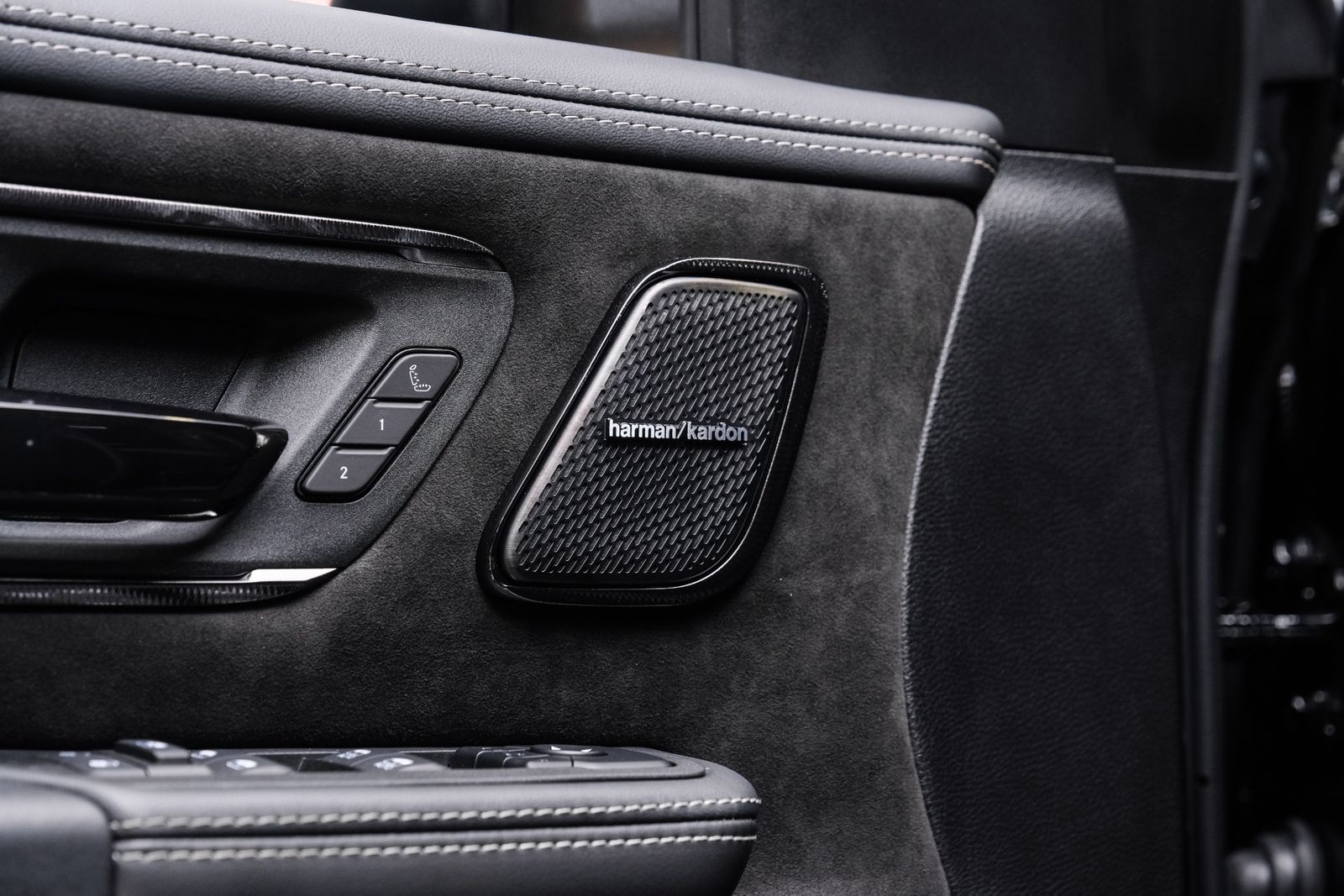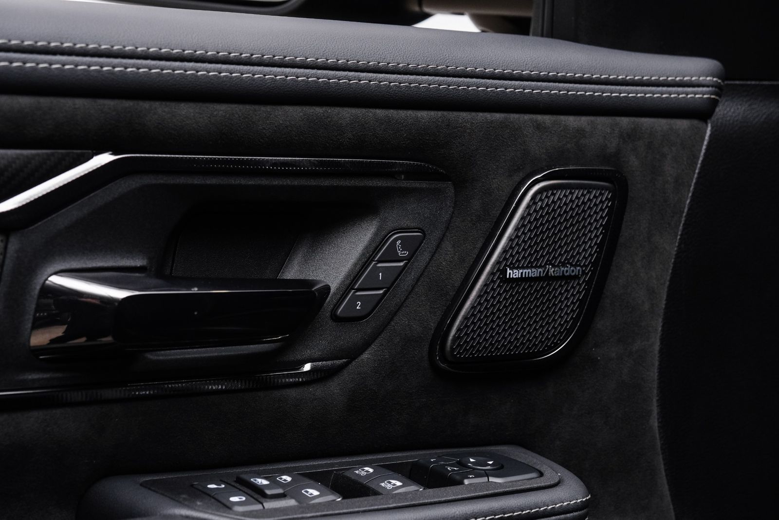 Includes UConnect with 14.4 inch touch screen display, Apple Carplay, Android Auto, AM/FM radio, HD radio, integrated voice command with Bluetooth, media hub with USB and auxiliary audio inputs, GPS navigation, SiriusXM 360L satellite radio with Traffic Plus, Travel Link, 4G Harman Kardon 19 speaker audio system with 900 watts, LTE Wi-Fi hotspot, wireless charging pad, 10.25 inch front passenger interactive display, smartphone as a key capable, front ventilated and massaging seats, recline 60/40 split folding seat, rear heated seats, full length premium upgraded floor console, leather/carbon flat-bottom steering wheel, real carbon fiber interior accents, luxury front door panel trim, wrapped driver and passenger assist handles, power adjustable pedals, 2-driver memory for driver seat, radio, exterior mirrors, and pedals, rain-sensitive windshield wipers, hands-free active driving assist, evasive steering assist, intersection collision assist system, drowsy driver detection, traffic sign recognition, head-up display, rearview auto-dimming digital display mirror, surround vision camera system, LED CHMSL lamp, power open/close tailgate, 12-pin trailer connector, and 240 amp alternator.