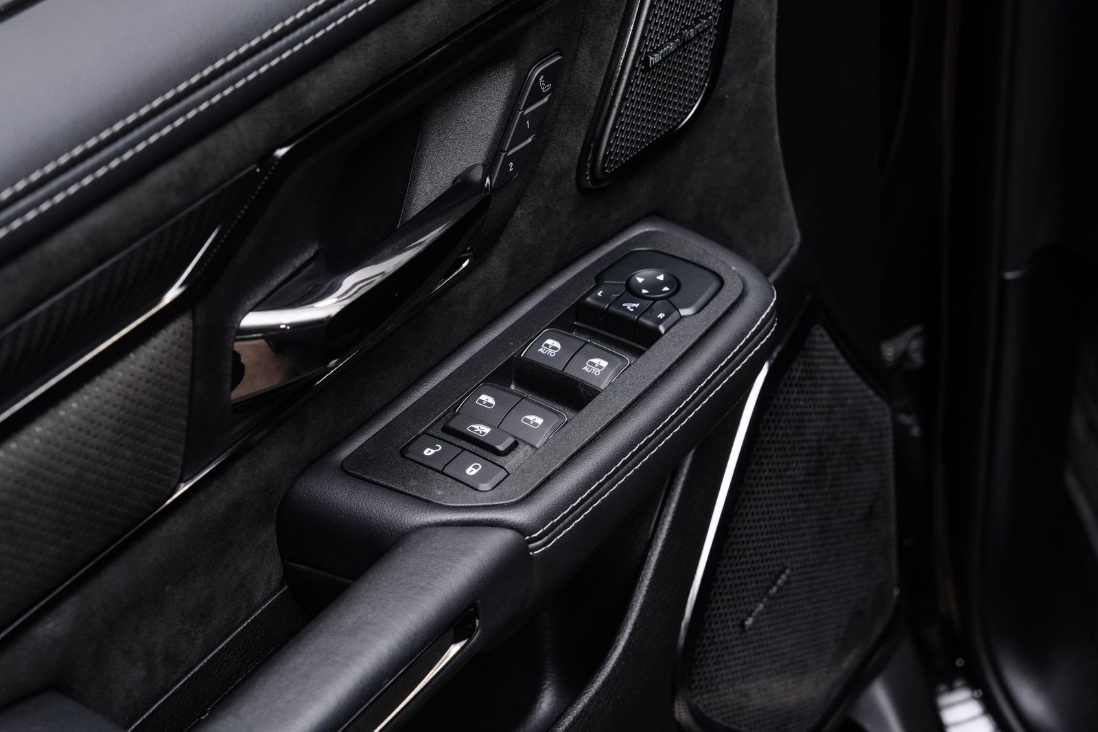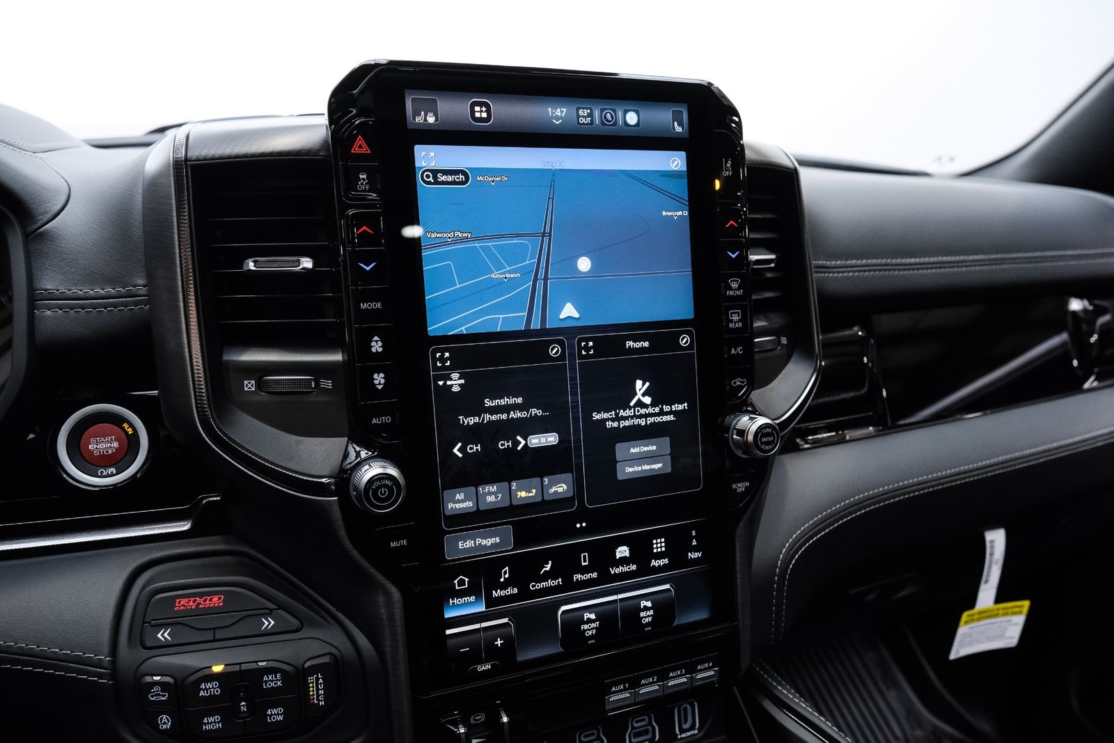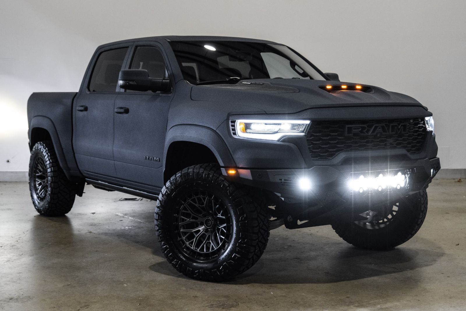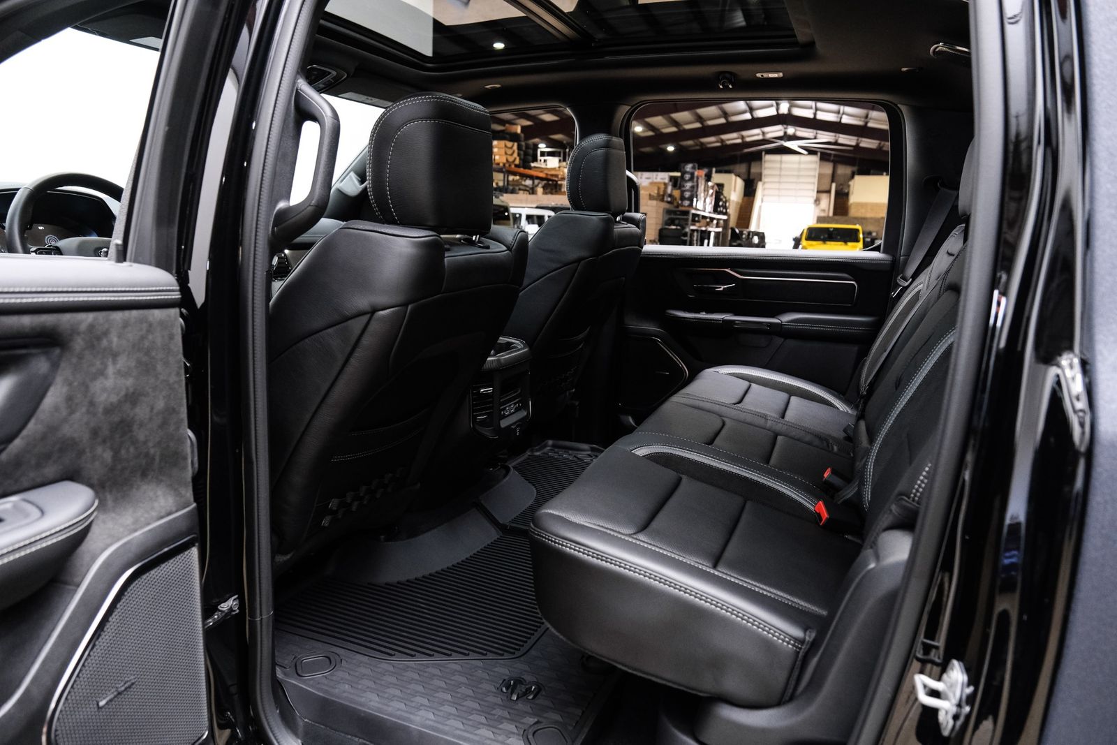 Includes UConnect with 14.4 inch touch screen display, Apple Carplay, Android Auto, AM/FM radio, HD radio, integrated voice command with Bluetooth, media hub with USB and auxiliary audio inputs, GPS navigation, SiriusXM 360L satellite radio with Traffic Plus, Travel Link, 4G Harman Kardon 19 speaker audio system with 900 watts, LTE Wi-Fi hotspot, wireless charging pad, 10.25 inch front passenger interactive display, smartphone as a key capable, front ventilated and massaging seats, recline 60/40 split folding seat, rear heated seats, full length premium upgraded floor console, leather/carbon flat-bottom steering wheel, real carbon fiber interior accents, luxury front door panel trim, wrapped driver and passenger assist handles, power adjustable pedals, 2-driver memory for driver seat, radio, exterior mirrors, and pedals, rain-sensitive windshield wipers, hands-free active driving assist, evasive steering assist, intersection collision assist system, drowsy driver detection, traffic sign recognition, head-up display, rearview auto-dimming digital display mirror, surround vision camera system, LED CHMSL lamp, power open/close tailgate, 12-pin trailer connector, and 240 amp alternator.