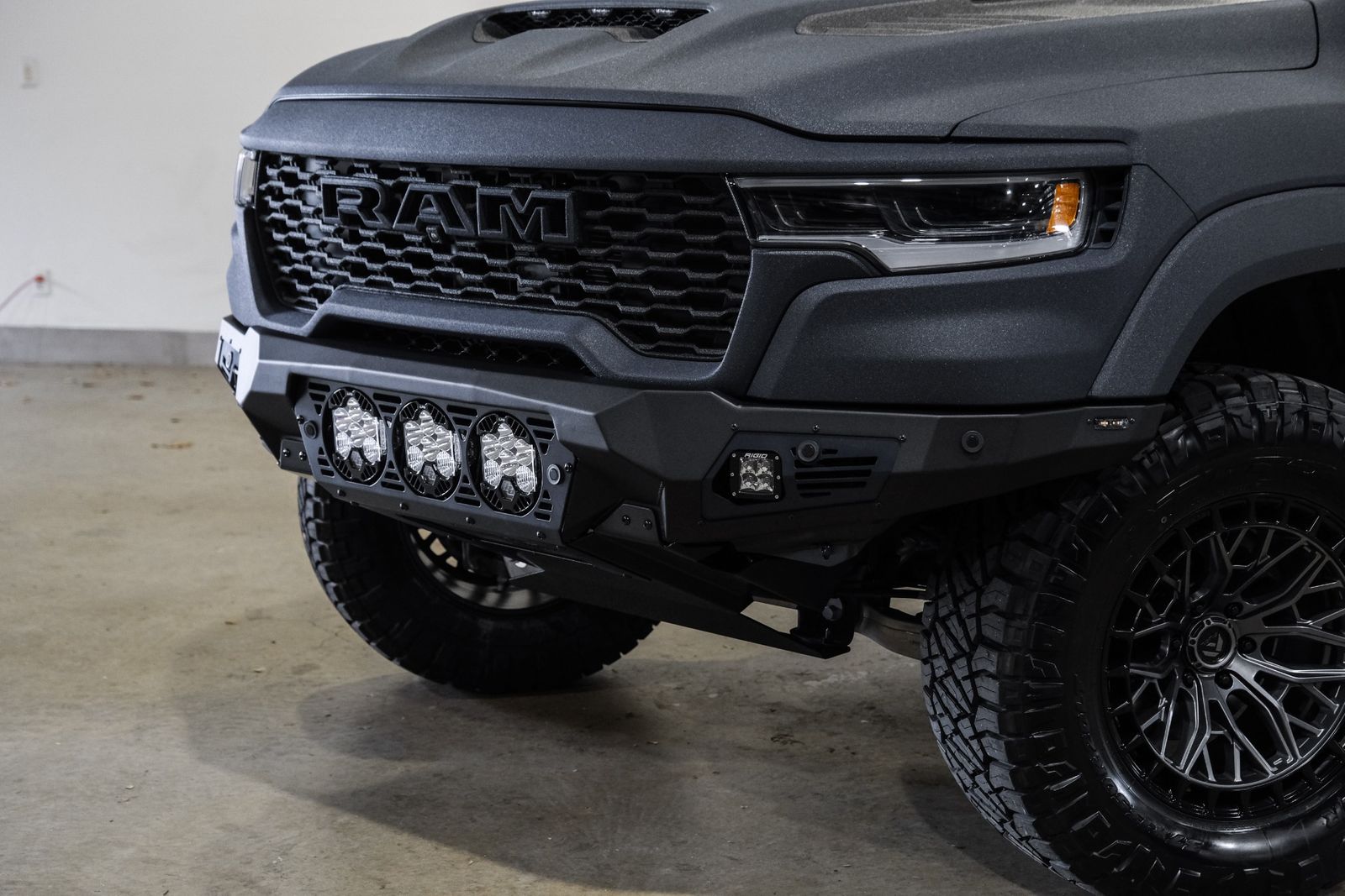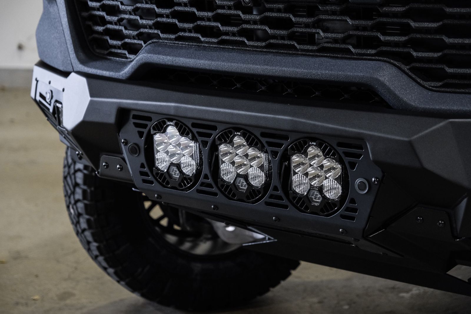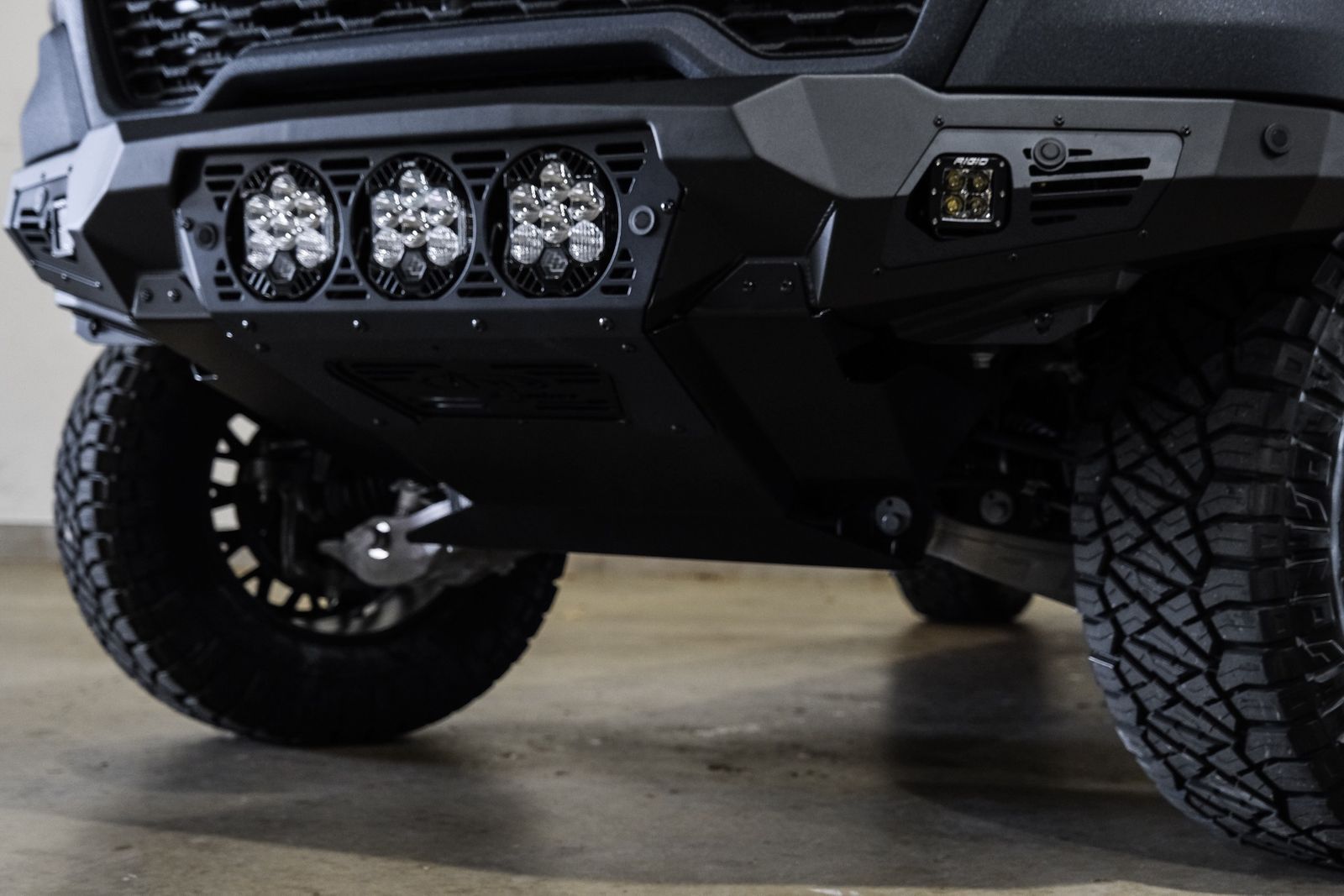 * ADDICTIVE DESERT DESIGNS BOMBER FRONT BUMPER WITH 3 BAJA DESIGNS LP6 ROUND LED LIGHTS & 2 RIGID SIDE LED LIGHTS