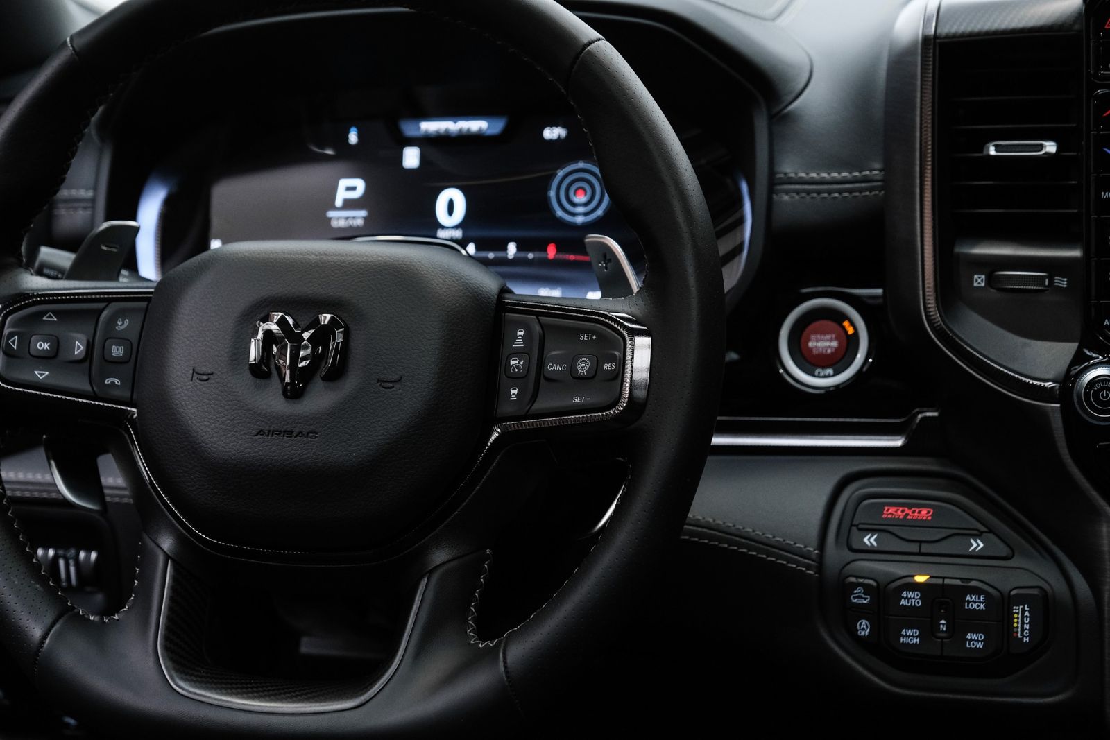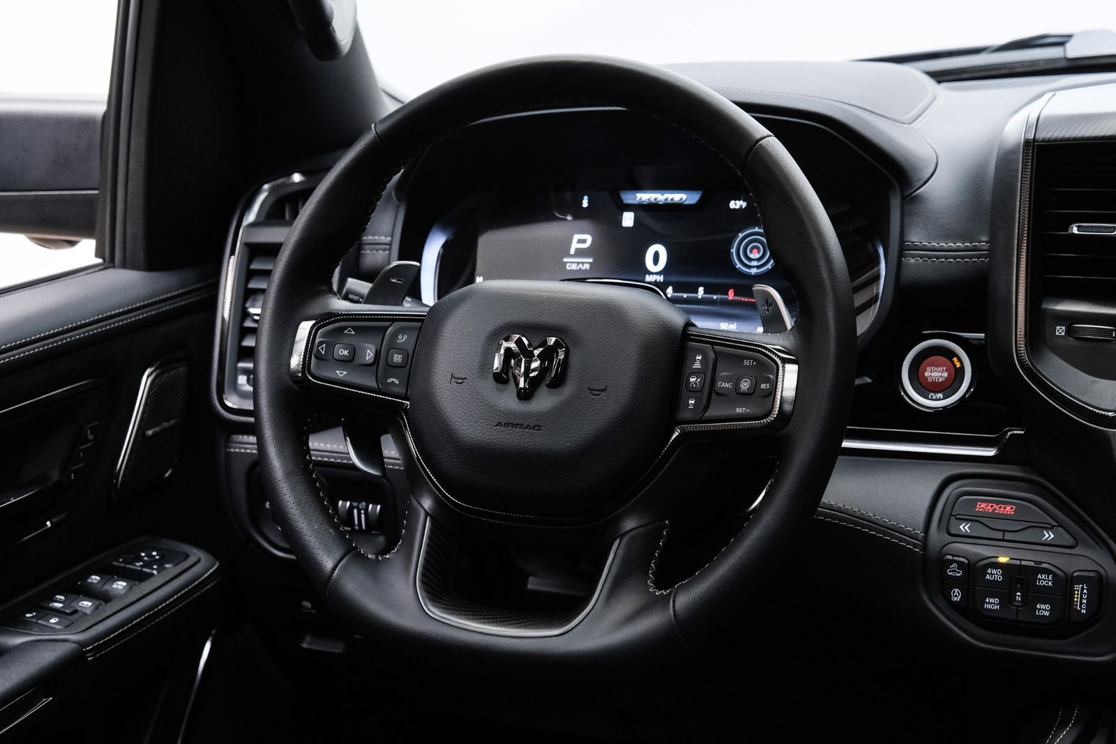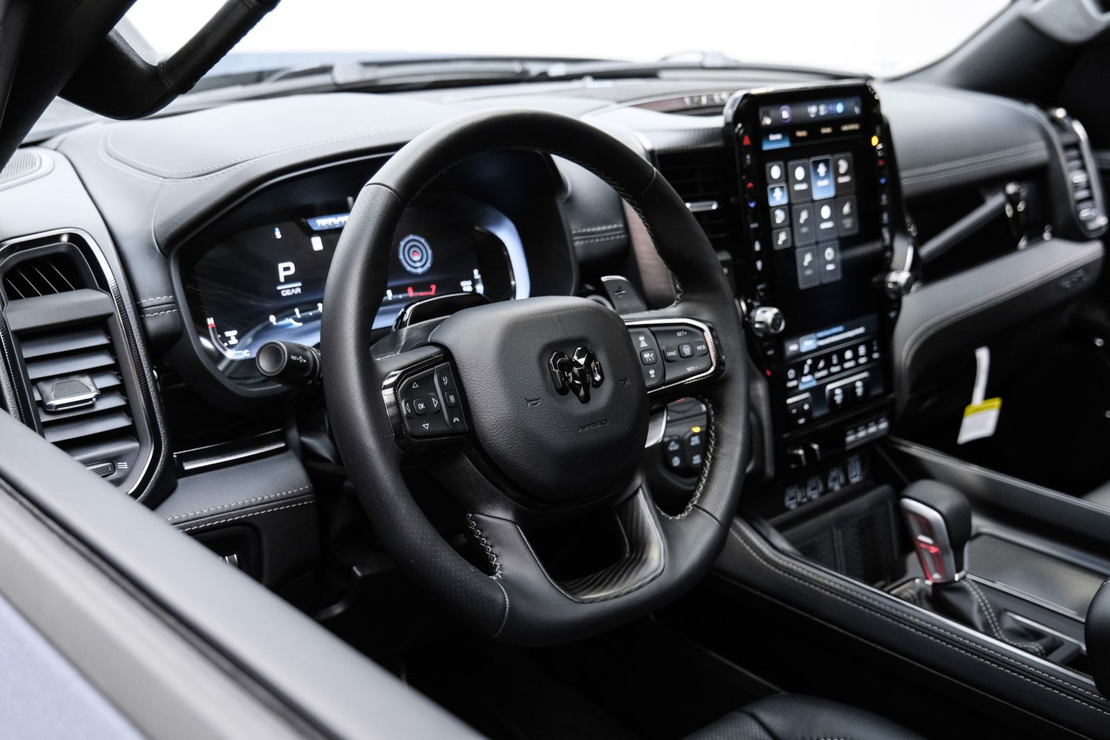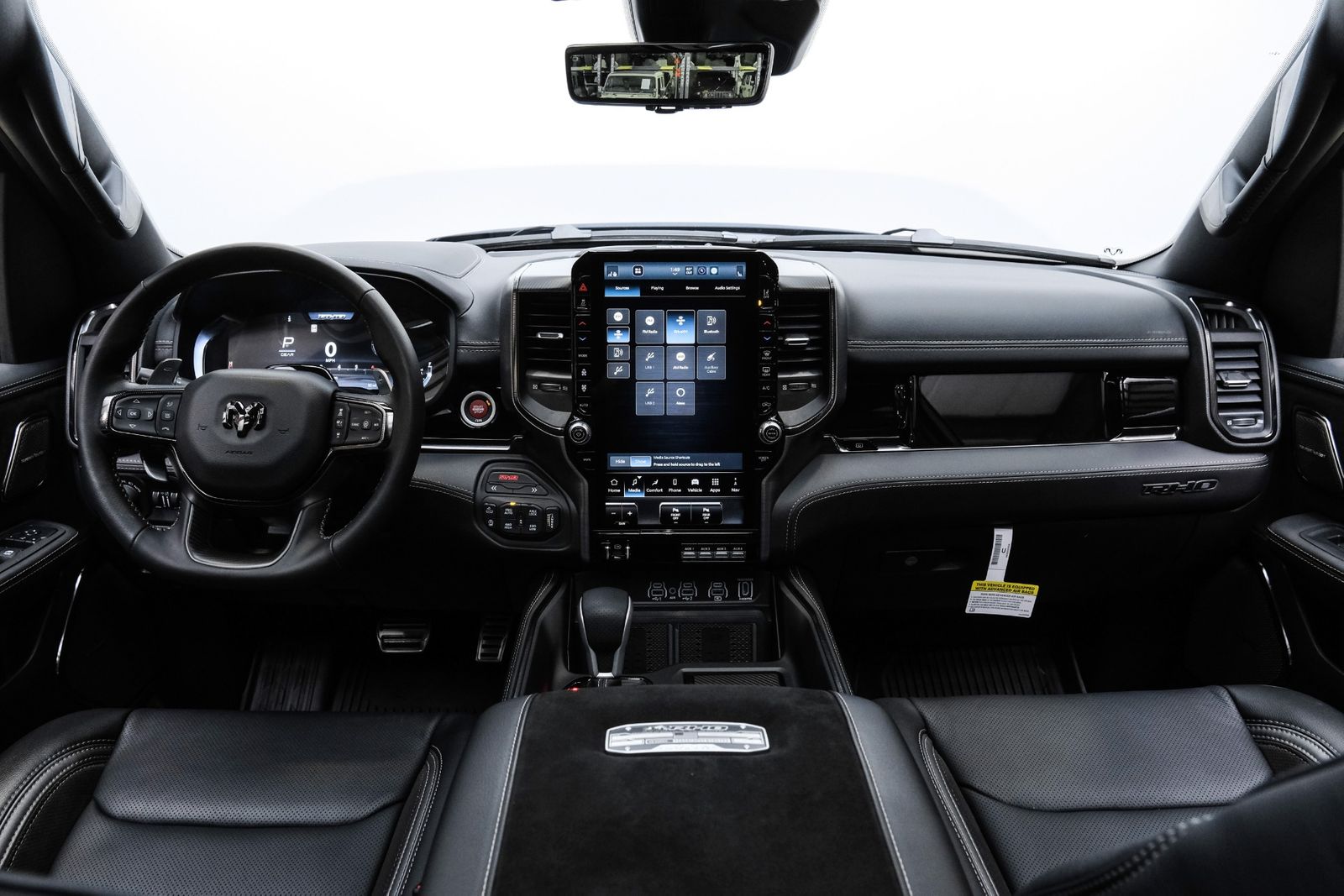 Includes UConnect with 14.4 inch touch screen display, Apple Carplay, Android Auto, AM/FM radio, HD radio, integrated voice command with Bluetooth, media hub with USB and auxiliary audio inputs, GPS navigation, SiriusXM 360L satellite radio with Traffic Plus, Travel Link, 4G Harman Kardon 19 speaker audio system with 900 watts, LTE Wi-Fi hotspot, wireless charging pad, 10.25 inch front passenger interactive display, smartphone as a key capable, front ventilated and massaging seats, recline 60/40 split folding seat, rear heated seats, full length premium upgraded floor console, leather/carbon flat-bottom steering wheel, real carbon fiber interior accents, luxury front door panel trim, wrapped driver and passenger assist handles, power adjustable pedals, 2-driver memory for driver seat, radio, exterior mirrors, and pedals, rain-sensitive windshield wipers, hands-free active driving assist, evasive steering assist, intersection collision assist system, drowsy driver detection, traffic sign recognition, head-up display, rearview auto-dimming digital display mirror, surround vision camera system, LED CHMSL lamp, power open/close tailgate, 12-pin trailer connector, and 240 amp alternator.