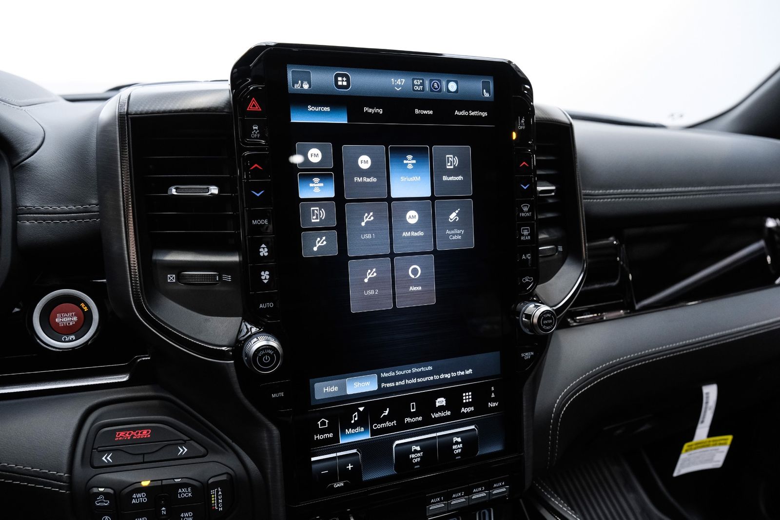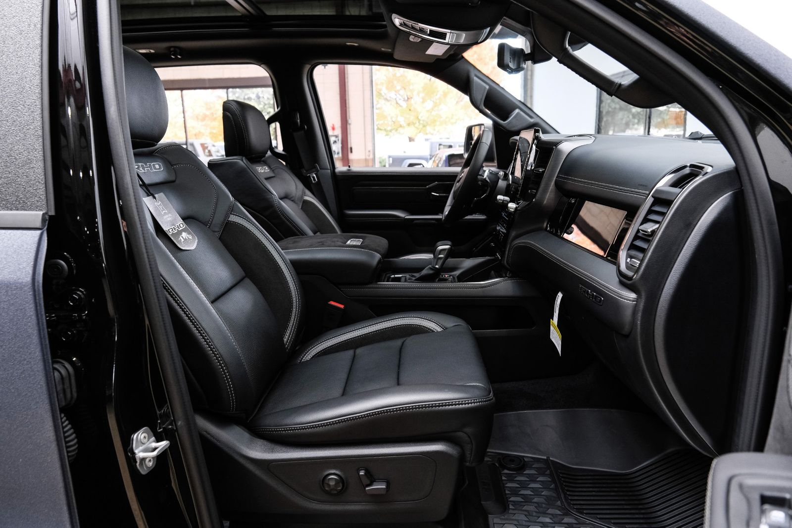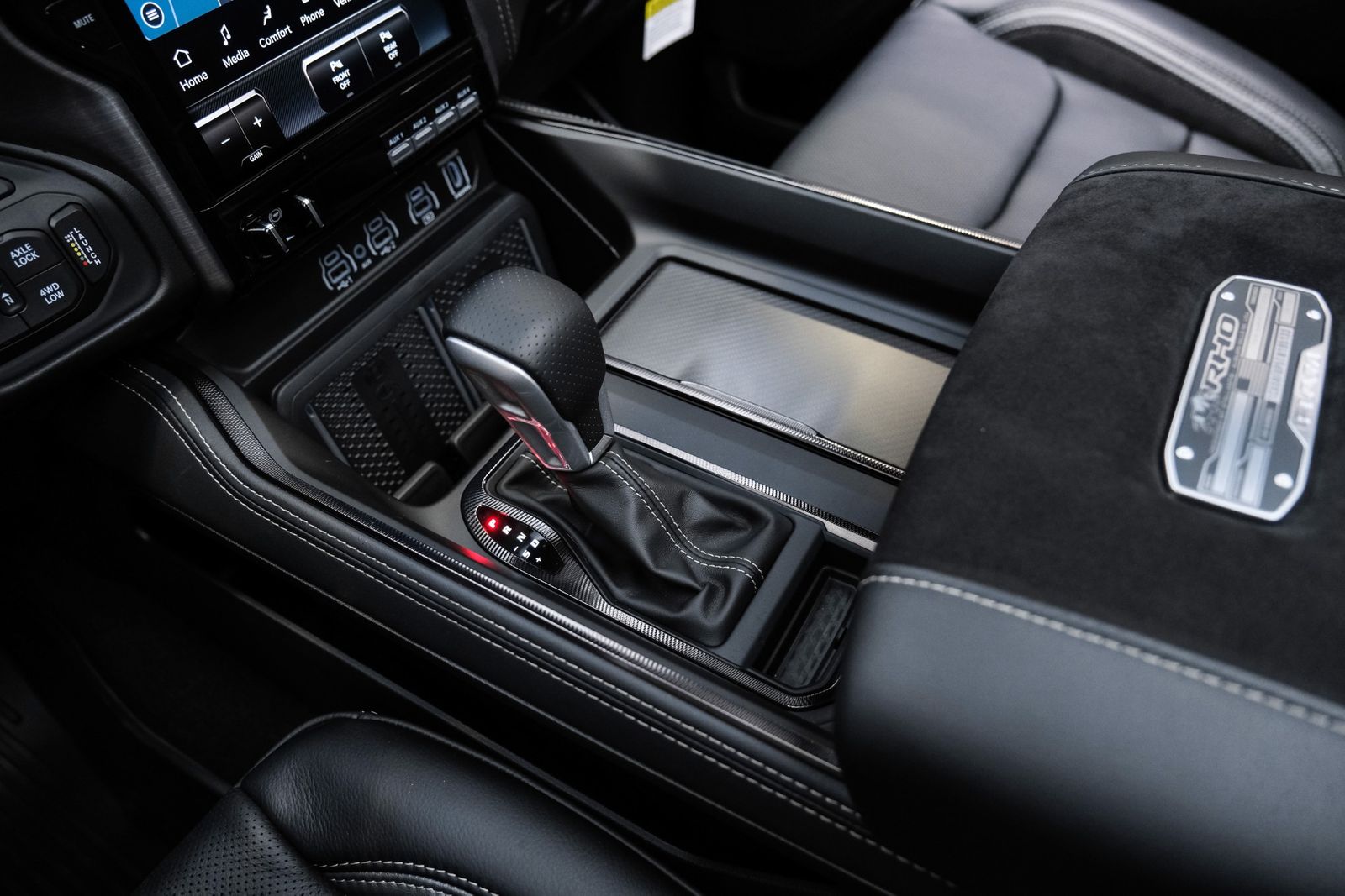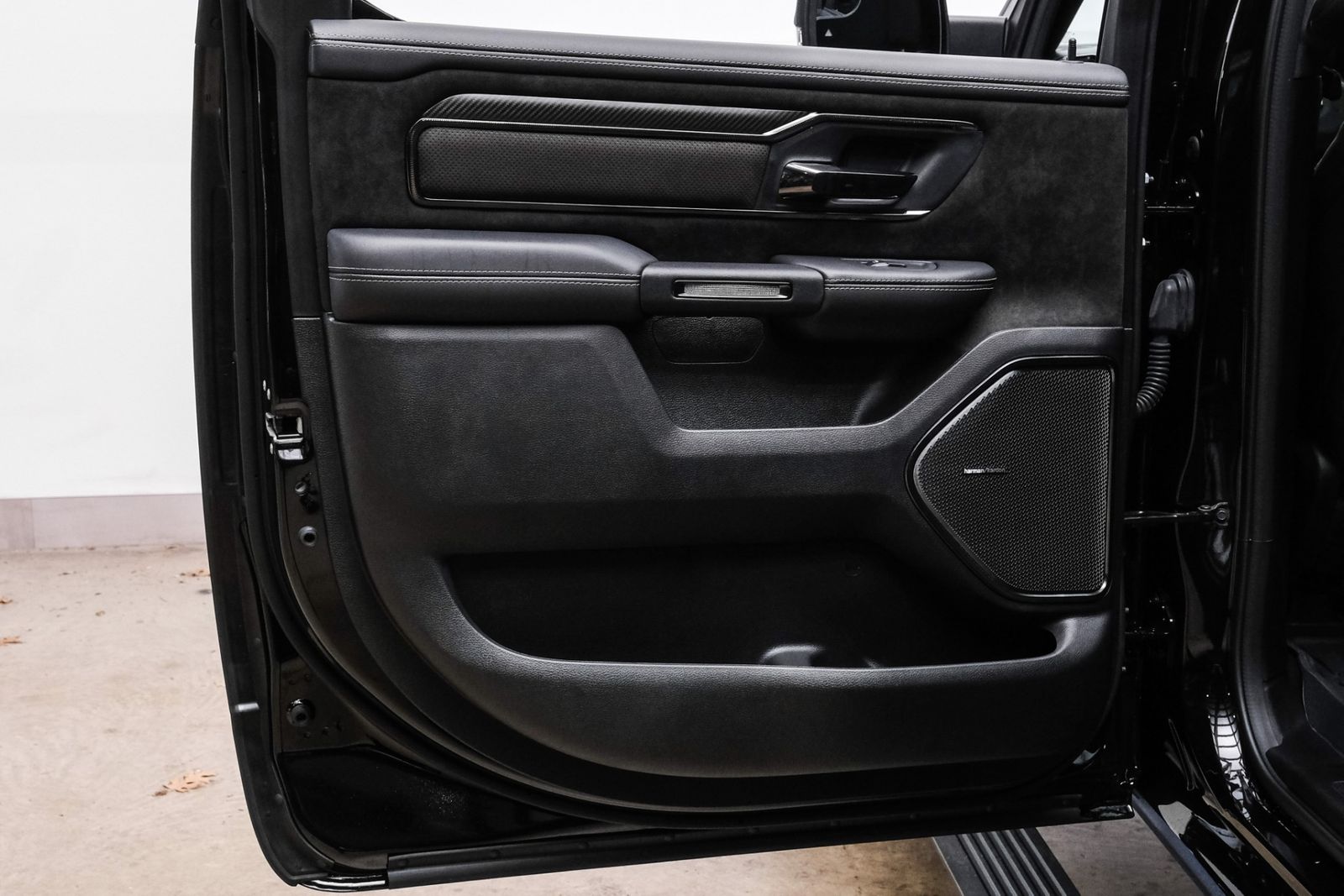 Includes UConnect with 14.4 inch touch screen display, Apple Carplay, Android Auto, AM/FM radio, HD radio, integrated voice command with Bluetooth, media hub with USB and auxiliary audio inputs, GPS navigation, SiriusXM 360L satellite radio with Traffic Plus, Travel Link, 4G Harman Kardon 19 speaker audio system with 900 watts, LTE Wi-Fi hotspot, wireless charging pad, 10.25 inch front passenger interactive display, smartphone as a key capable, front ventilated and massaging seats, recline 60/40 split folding seat, rear heated seats, full length premium upgraded floor console, leather/carbon flat-bottom steering wheel, real carbon fiber interior accents, luxury front door panel trim, wrapped driver and passenger assist handles, power adjustable pedals, 2-driver memory for driver seat, radio, exterior mirrors, and pedals, rain-sensitive windshield wipers, hands-free active driving assist, evasive steering assist, intersection collision assist system, drowsy driver detection, traffic sign recognition, head-up display, rearview auto-dimming digital display mirror, surround vision camera system, LED CHMSL lamp, power open/close tailgate, 12-pin trailer connector, and 240 amp alternator.