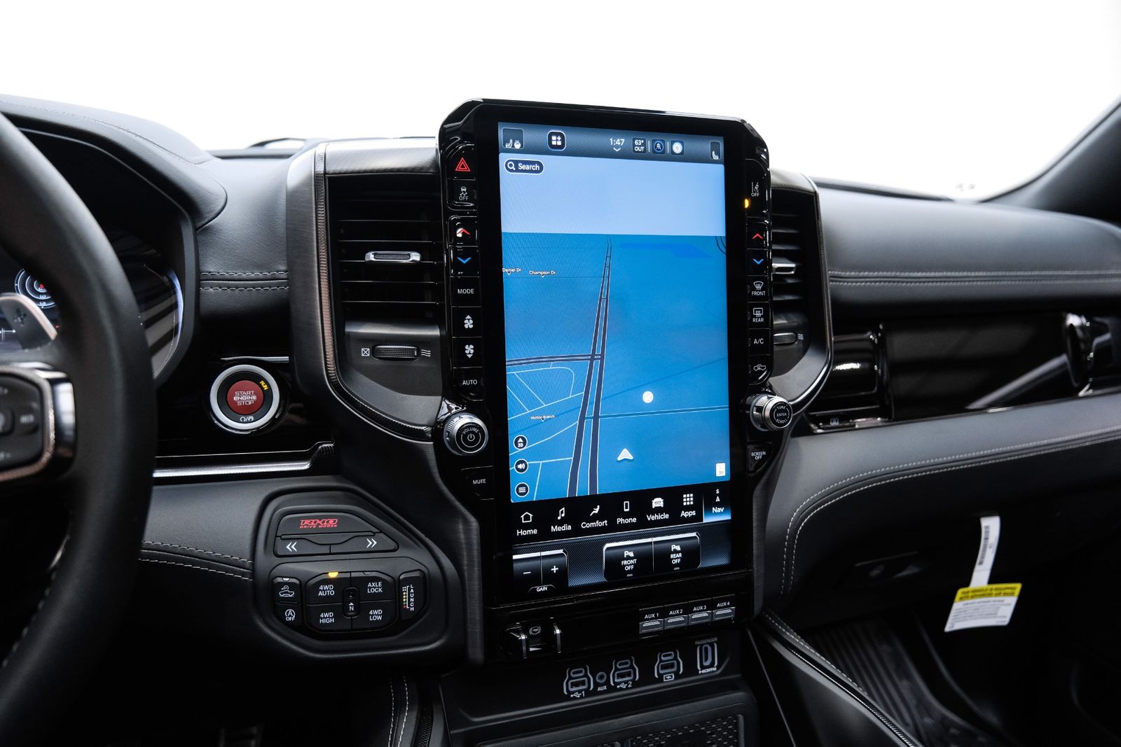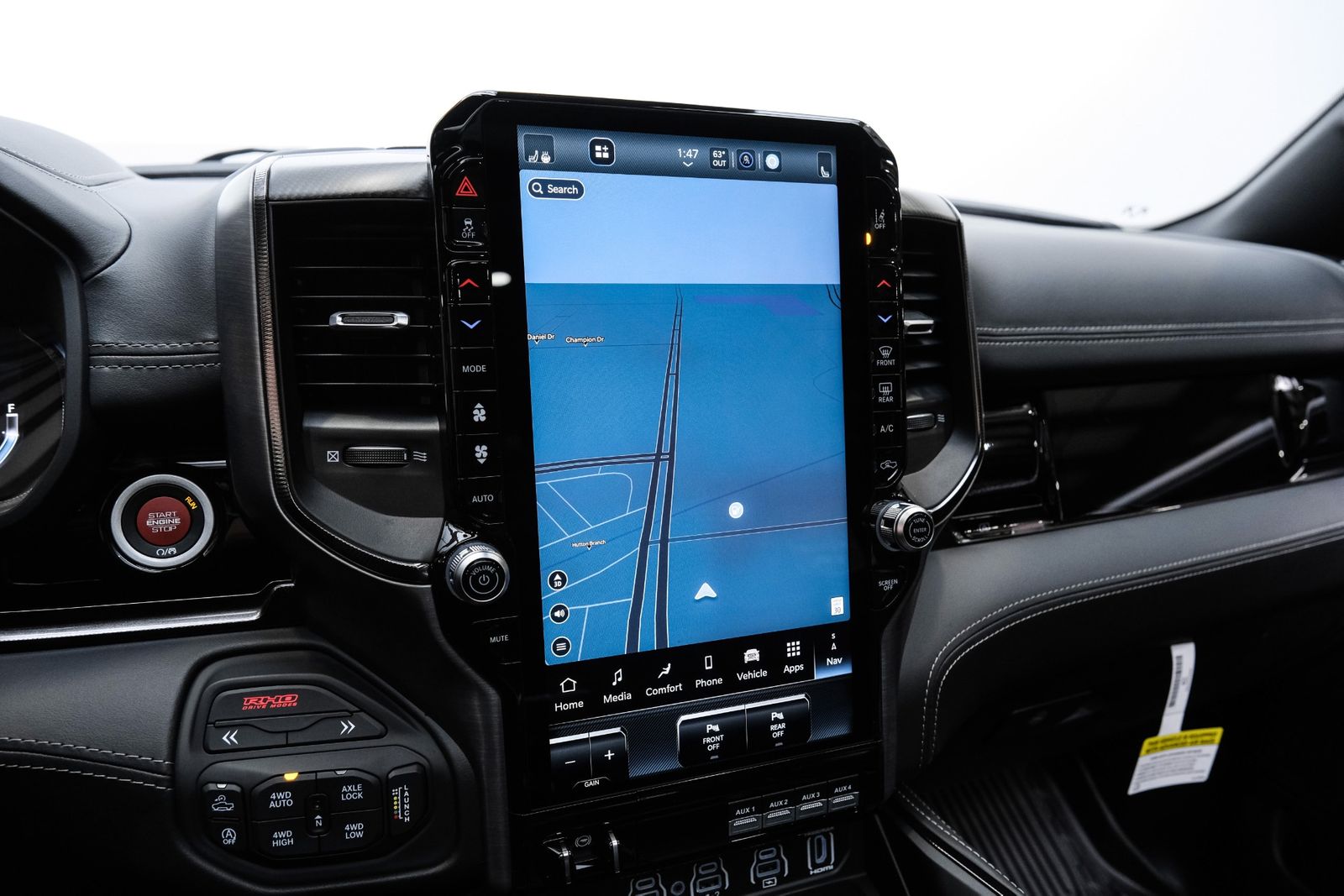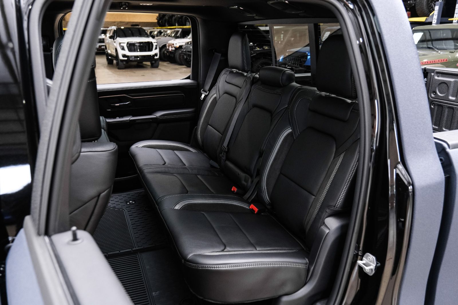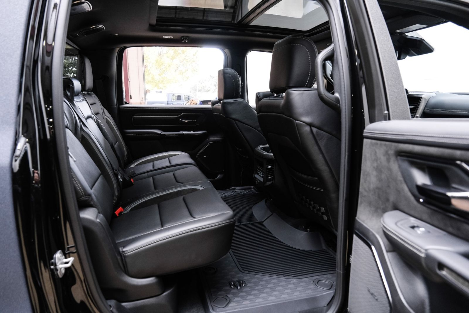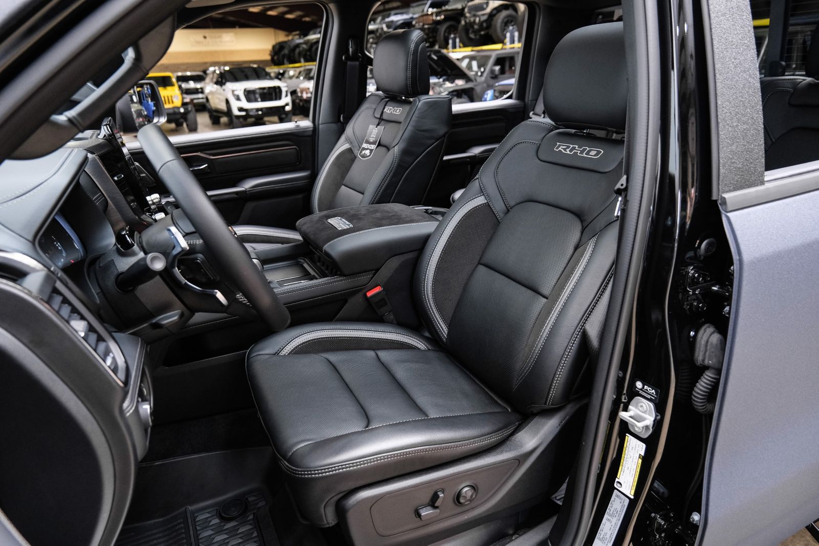 Includes UConnect with 14.4 inch touch screen display, Apple Carplay, Android Auto, AM/FM radio, HD radio, integrated voice command with Bluetooth, media hub with USB and auxiliary audio inputs, GPS navigation, SiriusXM 360L satellite radio with Traffic Plus, Travel Link, 4G Harman Kardon 19 speaker audio system with 900 watts, LTE Wi-Fi hotspot, wireless charging pad, 10.25 inch front passenger interactive display, smartphone as a key capable, front ventilated and massaging seats, recline 60/40 split folding seat, rear heated seats, full length premium upgraded floor console, leather/carbon flat-bottom steering wheel, real carbon fiber interior accents, luxury front door panel trim, wrapped driver and passenger assist handles, power adjustable pedals, 2-driver memory for driver seat, radio, exterior mirrors, and pedals, rain-sensitive windshield wipers, hands-free active driving assist, evasive steering assist, intersection collision assist system, drowsy driver detection, traffic sign recognition, head-up display, rearview auto-dimming digital display mirror, surround vision camera system, LED CHMSL lamp, power open/close tailgate, 12-pin trailer connector, and 240 amp alternator.