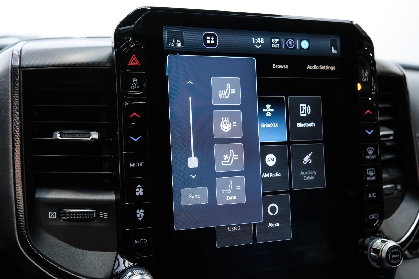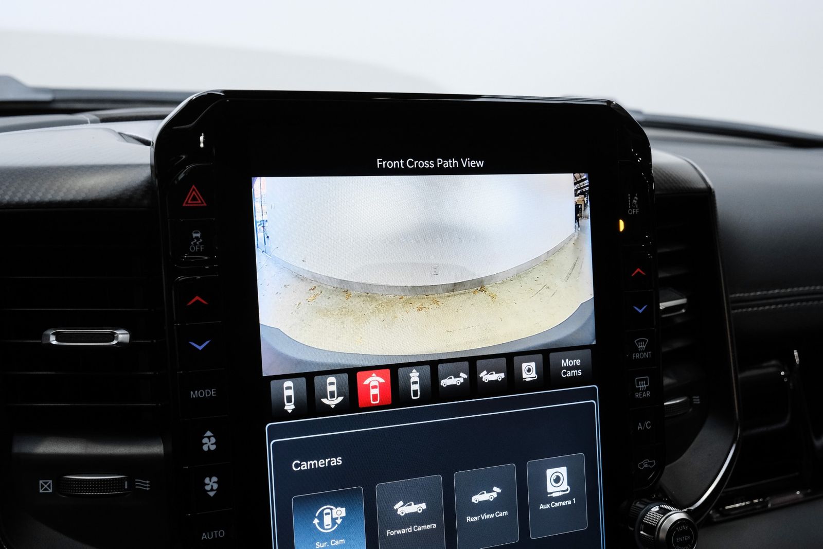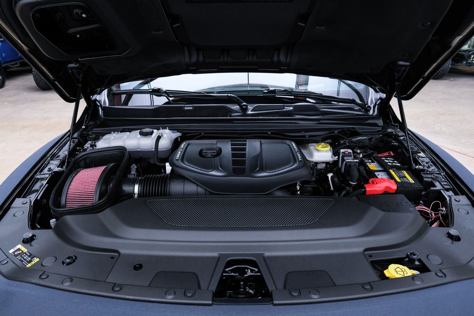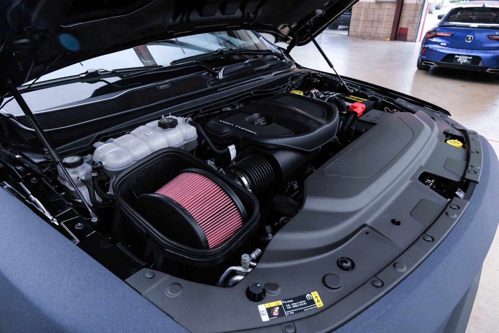 Includes UConnect with 14.4 inch touch screen display, Apple Carplay, Android Auto, AM/FM radio, HD radio, integrated voice command with Bluetooth, media hub with USB and auxiliary audio inputs, GPS navigation, SiriusXM 360L satellite radio with Traffic Plus, Travel Link, 4G Harman Kardon 19 speaker audio system with 900 watts, LTE Wi-Fi hotspot, wireless charging pad, 10.25 inch front passenger interactive display, smartphone as a key capable, front ventilated and massaging seats, recline 60/40 split folding seat, rear heated seats, full length premium upgraded floor console, leather/carbon flat-bottom steering wheel, real carbon fiber interior accents, luxury front door panel trim, wrapped driver and passenger assist handles, power adjustable pedals, 2-driver memory for driver seat, radio, exterior mirrors, and pedals, rain-sensitive windshield wipers, hands-free active driving assist, evasive steering assist, intersection collision assist system, drowsy driver detection, traffic sign recognition, head-up display, rearview auto-dimming digital display mirror, surround vision camera system, LED CHMSL lamp, power open/close tailgate, 12-pin trailer connector, and 240 amp alternator.