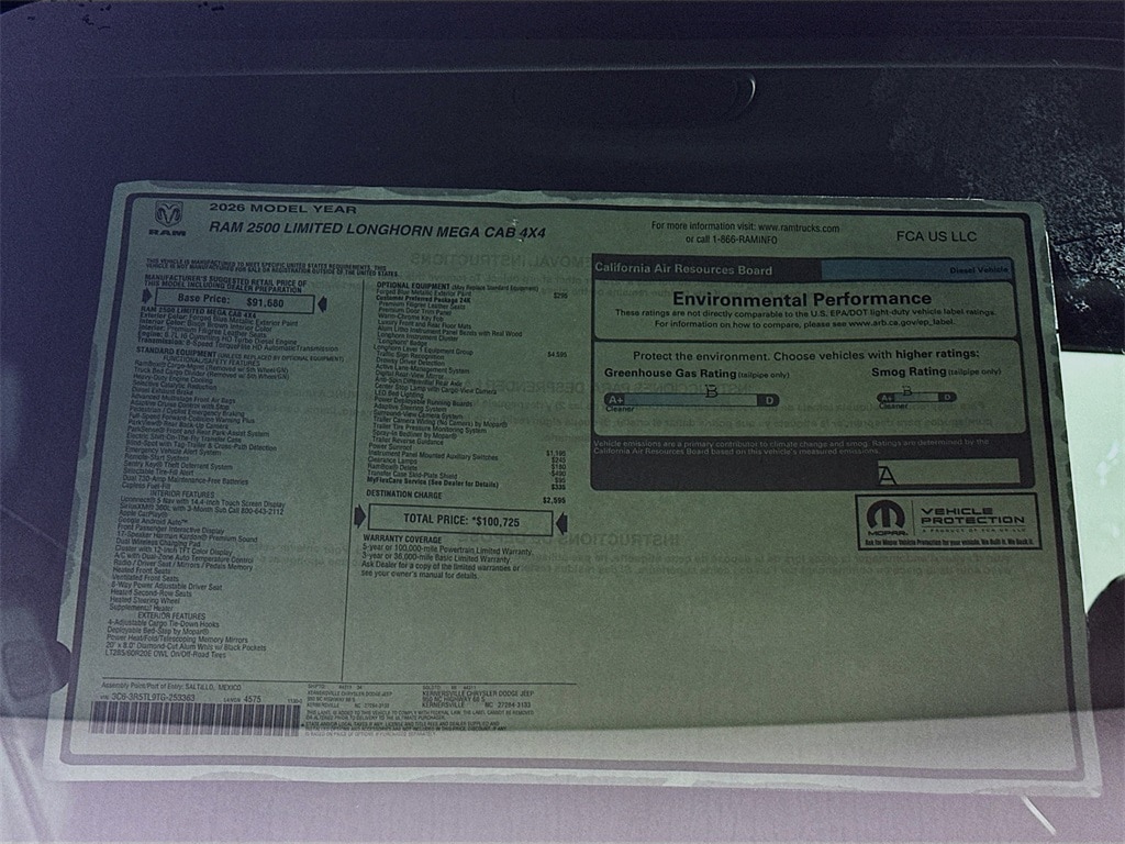 MORE ABOUT THIS 2026 Ram 2500 Limited Longhorn 14in Truck Mega Cab LEATHER HEATED SEATS! SUNROOF! NAVIGATION! REMOTE START! BACKUP CAMERA! This 2026 RAM 2500 LIMITED LONGHORN MEGA CAB 4X4 TRUCK includes the following features: Package: 24K , Exterior Color: Forged Blue Metallic Exterior Paint , Interior Color: Bison Brown Premium Filigree Leather Seats , Engine: 6.7L I6 Cummins HO Turbo Diesel Engine , Transmission: 8 Speed TorqueFlite HD AutomaticTransmission , Adaptive Cruise Control with Stop , Full Speed Forward Collision Warning Plus , ParkView Rear Back Up Camera , ParkSense Front and Rear Park Assist System , Blind Spot with Tag Trailer And Cross Path Detection , Remote Start System , Sentry Key Theft Deterrent System , Uconnect 5 Nav with 14.4 Inch Touch Screen Display , Apple CarPlay , Google Android Auto , Heated Front Seats , Ventilated Front Seats , Heated Second Row Seats , Heated Steering Wheel , and much more! Please check the window sticker for a complete list of equipment. Kernersville Chrysler Dodge Jeep Ram in Kernersville, NC is located in the heart of North Carolina between Charlotte, NC and Raleigh, NC. We specialize in NO hassle out of state purchases we process your taxes, tags and title work for the city and state where the vehicle will be registered. RETURN TO TOP