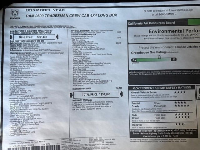 This is a new 2026 Ram 2500 Tradesman Crew Cab 4WD Long Box. It comes with the 3 year - 36,000 mile Factory Bumper to Bumper Warranty as well as a 5 year - 60,000 Factory Powertrain Warranty. It is equipped with a 6.4L V8 HEMI HD Engine, 8-Speed Automatic Transmission, Electronic Shift-On-The-Fly Transfer Case, Pedestrian/Cyclist Emergency Braking, Full-Speed Forward Collision Warning Plus, Adaptive Cruise Control with Stop, ParkView Rear Back-Up Camera, Electronic Stability Control, Hill-Start Assist, Anti-Lock 4-Wheel Disc Brakes, Speed-Sensitive Power Door Locks, Power Windows, Sentry Key Theft Deterrent System, Push-Button Start, Power Accessory Delay, Selectable Tire Fill Alert, Tire Pressure Monitoring Display, 32-Gallon Fuel Tank, Tailgate-Ajar Warning Lamps, 220-Amp Alternator, Google Android Auto, Apple CarPlay, Ram Connect (Connected Services) with Trial, 4G LTE Wi-Fi Hotspot, Full-Function Media Hub with 2-USB Plus Aux Port, 40/20/40 Split Front Bench Seat, 12-Volt Auxiliary Power Outlet, Cluster with 3.5-Inch TFT Color Display, Locking Tailgate, LED Low/High Reflector Headlamps, Front LED Fog Lamps, Tailgate Handle LED Hitch Lamp, Class V Receiver-Hitch, Trailer-Tow with 4-Pin Connector Wiring, Automatic Headlamps, Commercial Features Package, Bed Convenience Group, LED Bed Lighting, Spray-In Bedliner by Mopar, Tradesman Level 2 Equipment Group, Emergency Vehicle Alert System, 18-Inch x 8-Inch Steel Chrome-Clad Wheels, LT275/70R18 BSW All-Season Tires, Center Hub, 18-Inch Steel Spare Wheel, Convenience Group, Exterior 115V AC Outlet, Carpet Floor-Covering, Front and Rear Floor Mats, Power Adjustable Heated Exterior TT Mirrors with Manual Fold/Telescope, Exterior Mirrors with Supplemental Signals, Mirror Running Lights, Trailer Tow Pages, Anti-Spin Differential Rear Axle, Rear Power-Sliding Window, A/C with Dual-Zone Auto Temp Control, Bright Front and Rear Bumper, Black Tubular Side Steps by Mopar, SiriusXM 360L with 3-Month Sub Call 800-643-2112, ParkSense Front and Rear Park-Assist System, 400W Inverter, and Customer Preferred Package 2UA. The MSRP on this 2026 Ram 2500 Tradesman Crew Cab 4WD Long Box is $58,760. Our Internet and E-Bay pricing include rebates/incentives. You may qualify for additional rebate or discount. Please contact our sales department for details. *Financing: Sample payments are based on approved credit. Finance rates are available through Ally Bank or TD Bank. The price or payment does not include sales tax/tag, this is due to each state having a different sales tax rate. *A.P.R. - Annual Percentage Rate - The annual rate that is charged for borrowing, expressed as a number that expresses the yearly cost for the term of the loan. Click here for more information - www.consumerfinance.gov
