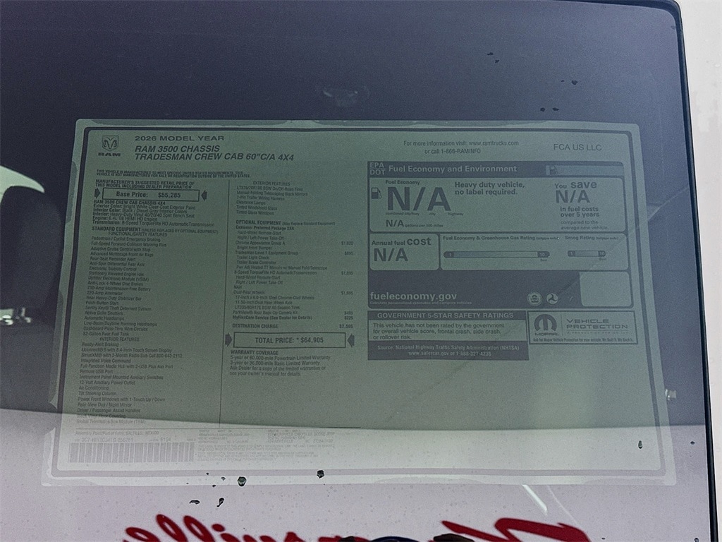MORE ABOUT THIS 2026 Ram 3500 Chassis Tradesman 60CA Dually Truck Crew Cab You won't want to miss this excellent value! It comes equipped with all the standard amenities for your driving enjoyment. All of the following features are included: delay-off headlights, tilt steering wheel, and 1-touch window functionality. Come down to our dealership, where you can browse our entire inventory in person.