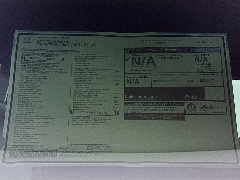 On new vehicles we offer free shipping and trade-in pick up within 250 miles from our location in Kernersville, NC. Alternatively, we offer complimentary airfare up to $500 USD and free shuttle pick up at Greensboro, Charlotte, or Raleigh airports. Give us a call to schedule your trip or get a free shipping quote.FINANCING AVAILABLE!When it comes to financing we can normally meet or beat the rate you have (WAC). Give us a try; we are a full service dealer, and we deal with over 40 lenders and do all the heavy work for you. If you finance with us, we will collect all taxes and tags in your State and complete all the paper work for you. You can find our secure application here: finance application.TRADE-IN OFFERS OVER THE PHONE!Give us call to obtain a Site Unseen Trade-in Appraisal and we'll make you an offer over the phone. Make sure to have all basic information regarding your vehicle ready for our internet consultant such as VIN number and condition of the interior and exterior, including tire tread and vehicles history. MORE ABOUT USWe are located in the heart of the Triad, between Greensboro, Winston-Salem, and High Point. We sell most of our vehicles online and are proudly the LARGEST heavy-duty truck dealer east of the Mississippi. We have a large inventory and it refreshes from week to week. We have an internet team dedicated to just our online customers and all of their needs. Our Internet team is available Monday-Friday 9AM-8PM EST and Saturday 9AM-6PM EST. If you reach us after hours we will return your call and email promptly on the next business day. We look forward to making you a part of our family!REVIEW ALL TERMSFor all new vehicles we will collect all taxes and tags applicable for your State. All taxes and fees must be paid in full in order for vehicle to be titled and registered. We are required to charge ALL customers a documentation fee of $899.50.Please review the Terms of Sale before placing your bid or making an offer. While every reasonable effort is made to ensure the accuracy of this listing, we are not responsible for any errors or omissions contained on this page. Please verify any information in question with Kernersville Chrysler Dodge Jeep Ram prior to bidding!