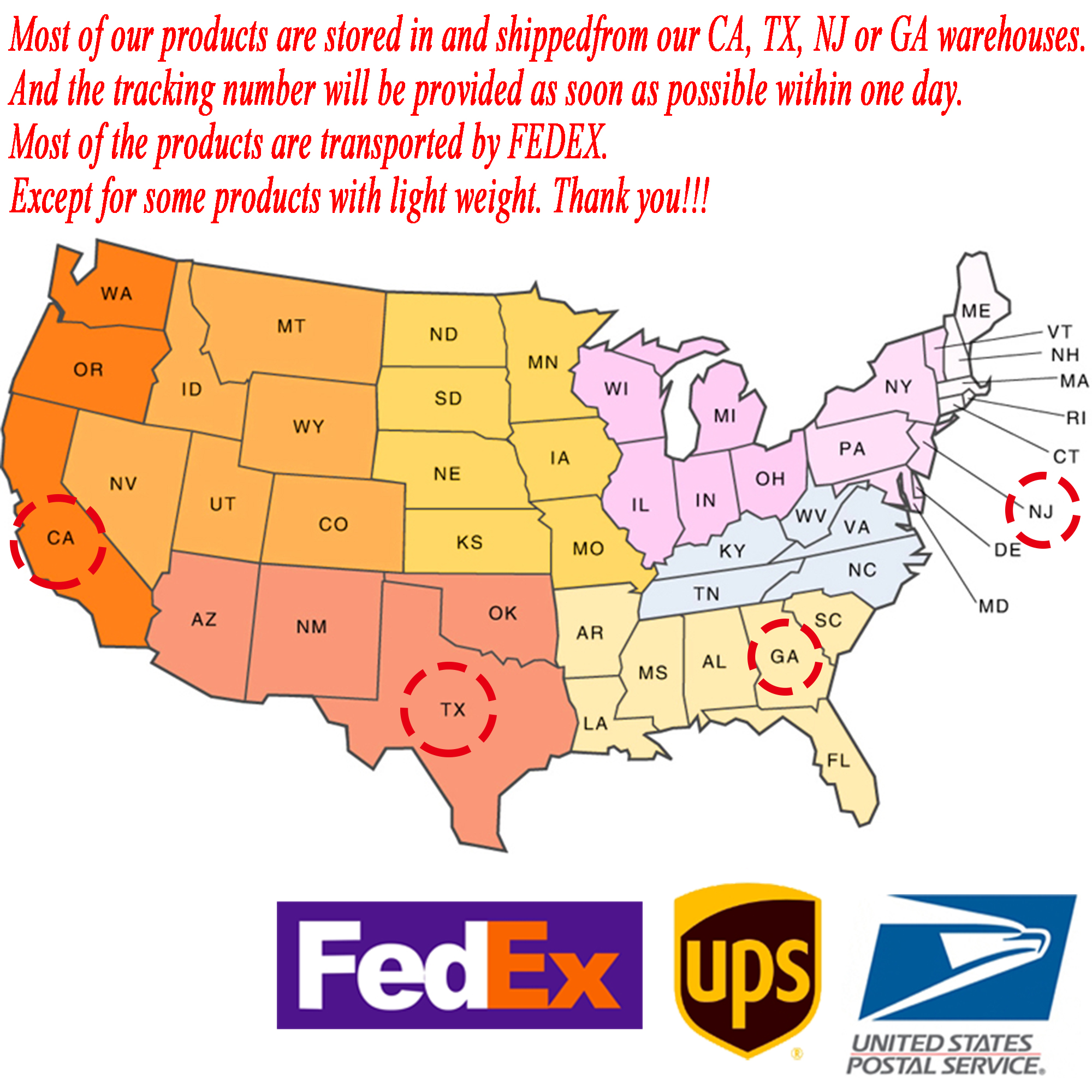 All USA location orders will be shipped out via USPS or UPS or Fedex with a tracking number. We do not ship to P.O. Boxes, APO/FPO or Military Mail Box.