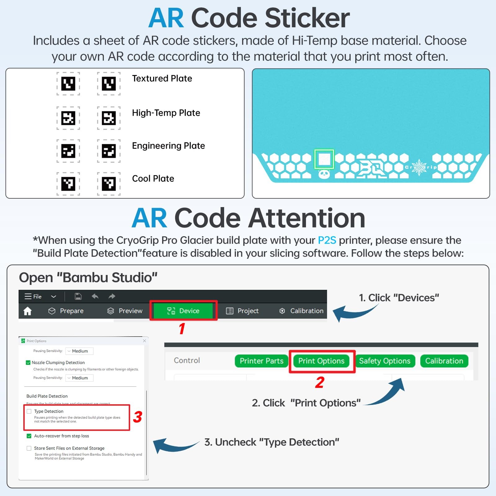 - Perfect Compatibility: CryoGrip Pro Glacier build plate is suitable for Bambu-Lab P1S, P1P, P2S, X1C, X1E, A1 3d printers. It is compatible with PLA(45-55 ), PETG(60-75 ), ABS, PA and other filament. Please NOTE the Glacier printing adhesion not as good as Frostbite with PLA and PETG, and if you are using P2S, please close the build plate printing detection