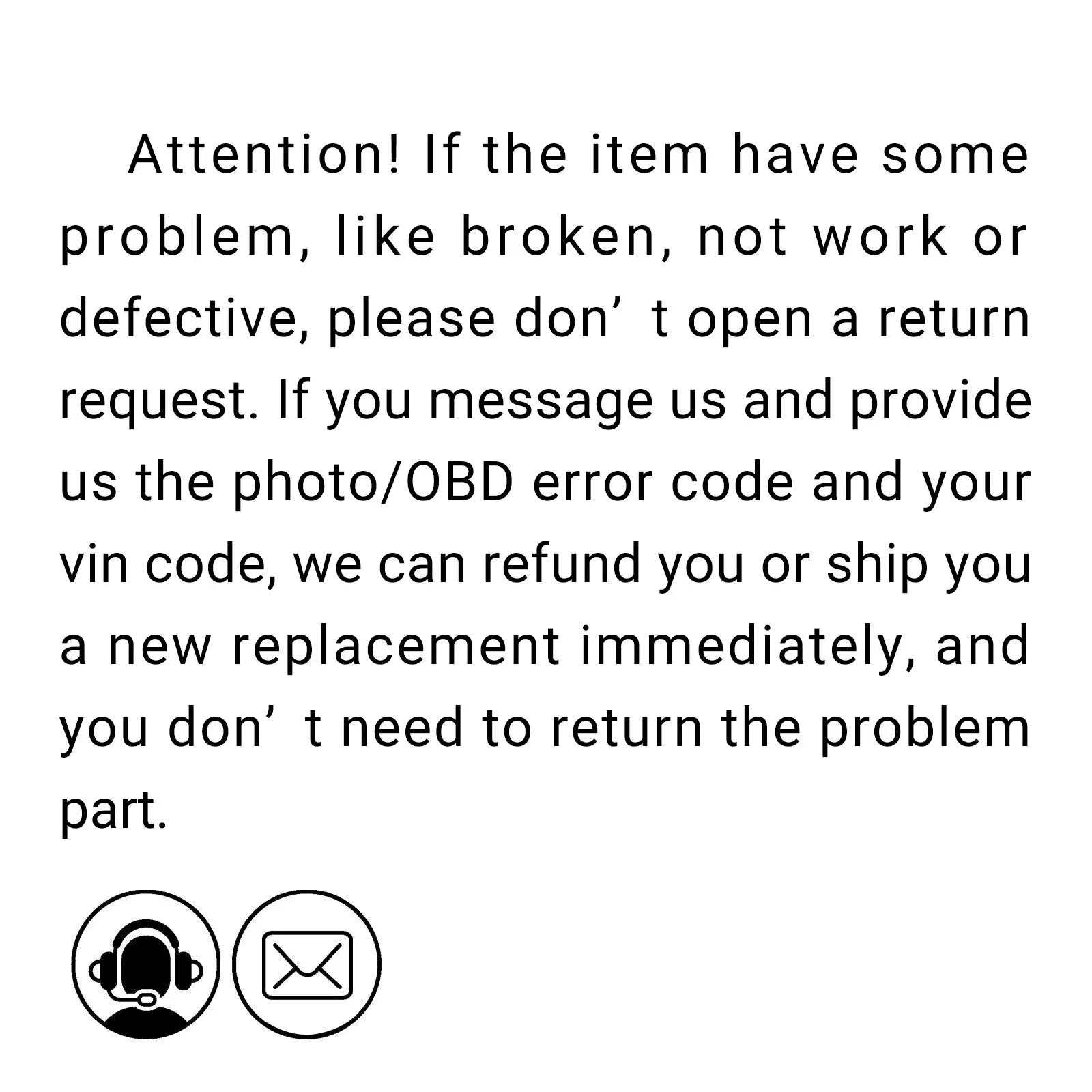 We offer 5 year warranty, if you meet quality problem, return and refund is acceptable. We offer not less than 30 days for return and refund policies, please let us know and provide the photos or video, we will resend it or refund you. But we reject the return if the item damaged by the buyer’s operational errors. Buyer pay the return shipping cost.