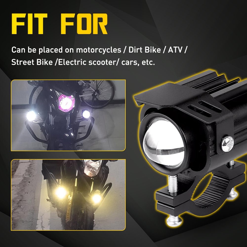 Features: *Ultra-Bright & Safe Clear White/Yellow LED beams cut through fog, rain, or darkness. Enhances visibility for safer night rides. *Built Tough for the Road Aluminum housing and shatterproof lenses withstand vibration, dust, and extreme temperatures. *Low Power, High Output Energy-efficient LEDs draw less from your power while delivering clear brightness. *Weatherproof Design IP68-rated seals keep water, mud, and grime out. Perfect as a high beam auxiliary lamp, headlight driving light, spotlight, fog lamp, work lamp, pod lamp, or spot lamp. *Easy to Install Fits most on Motorcycles/Dirt bikes/ATVs/Street bikes/Electric scooters/Cars, etc. Includes brackets and wiring, and no cutting or drilling needed.
