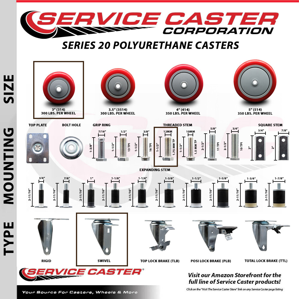 Listing is for one (1) Service Caster Series #20 stainless steel swivel caster with a 3" diameter by 1-1/4" wide red polyurethane wheel and a 12mm-1.75 X 1-1/2" threaded stem capable of supporting 300 lbs./caster.
