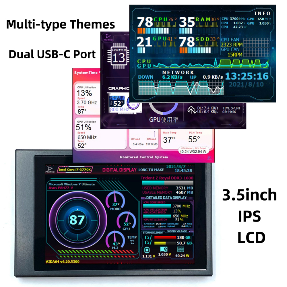 This 3.5inch display with multiple themes can be used easily, no additional power supplys is required, and no multimedias interface is required. I just need a USB data cable to use. It Support horizontal and vertical screen switching, 360 degree rotation, and is compatible with multiple systems. If you are looking for this product, come and have a try, it will not let you down.