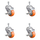 3.5 Inch Orange Polyurethane Swivel 3/8 Inch Threaded Stem Caster Set with Brake
