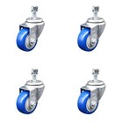 3.5 Inch SS Blue Polyurethane Wheel Swivel 12mm Threaded Stem Caster Set