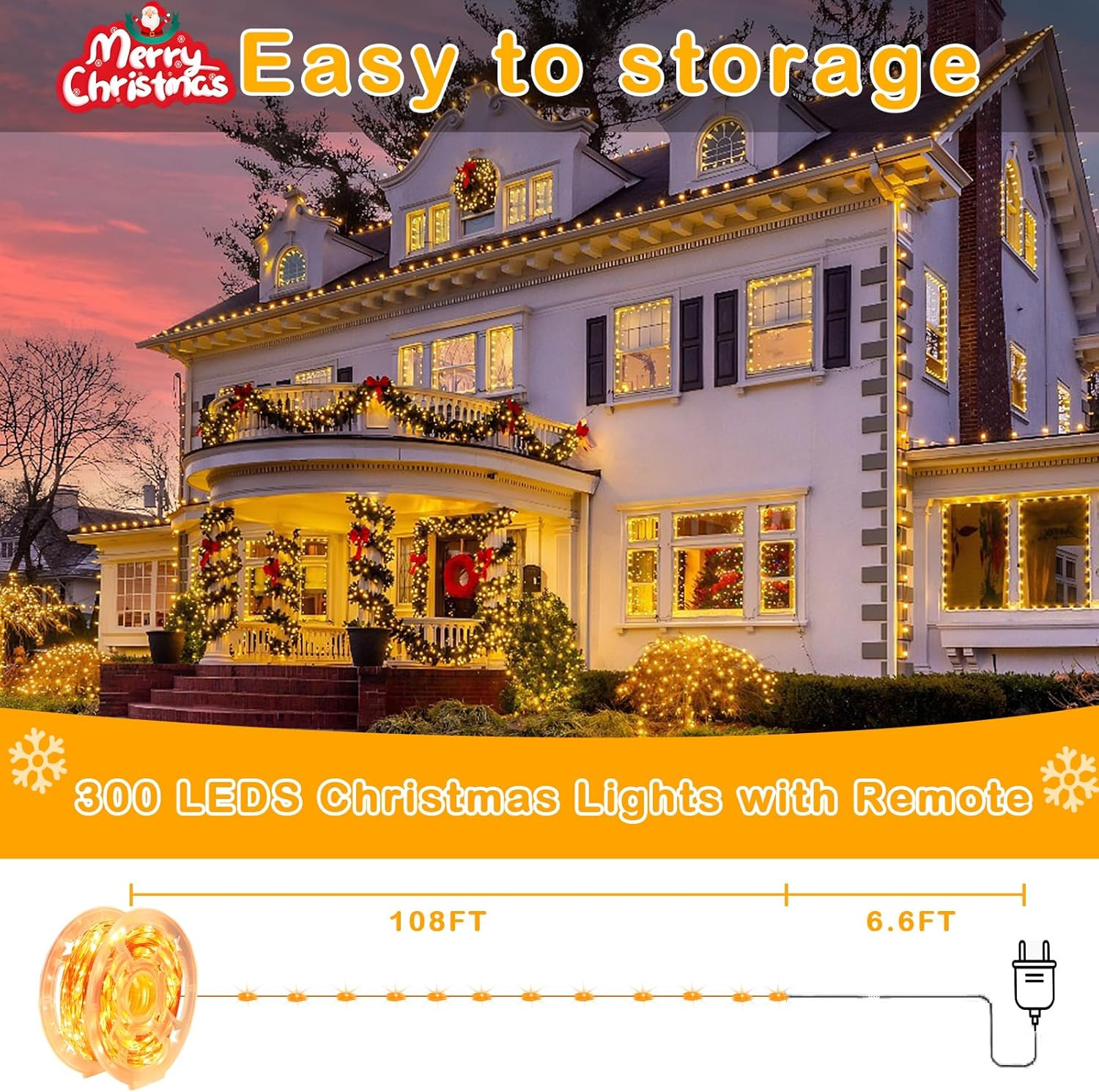 - Package Includes: 1x 300 LED holiday lights outdoor with reel; 1 x 24 keys remote control; 1 x user manual