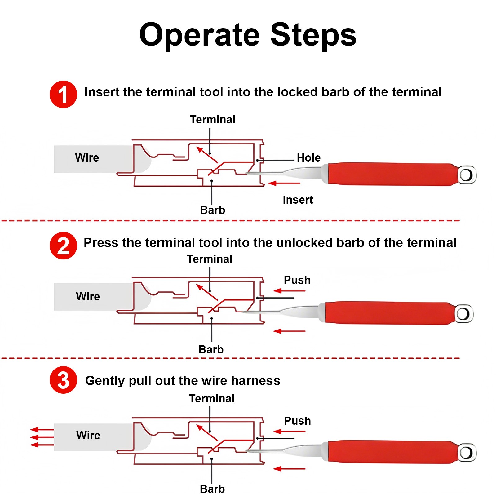 ✅Warm Tip: Cause most wire harnesses are clamped with barbs, please use a tool to lift or flatten the barbs, then gently pull out the end of the wire.