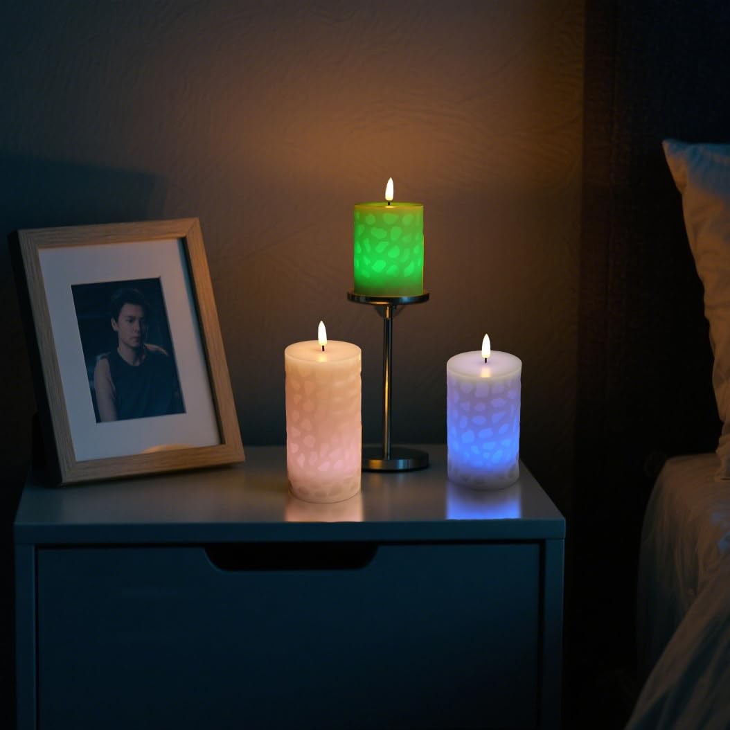 🕯|12 KINDS OF COLOR OPTIONS, DISPLAY SINGLE OR CARROUSEL OF ALL COLORS| -- 12 hues of light choices are available, among which you can find the proper one to fit the decoration or mood. When choosing the “MultiColor” mode on the remote, The color will CHANGE gradually and naturally, plus the 3D aesthetic carving texture, feasting your eyes in a smooth and comforting frequency, not flashing and blinking.