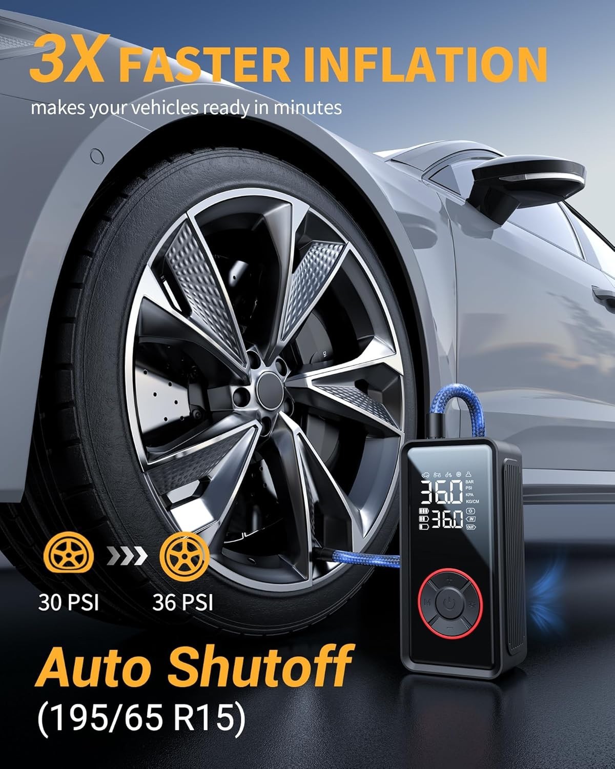- 3X Faster Inflation: High-efficiency motor and upgraded airflow system empower swift inflation—inflate a 195/65 R15 tire from 30 to 36 PSI in mere minutes.