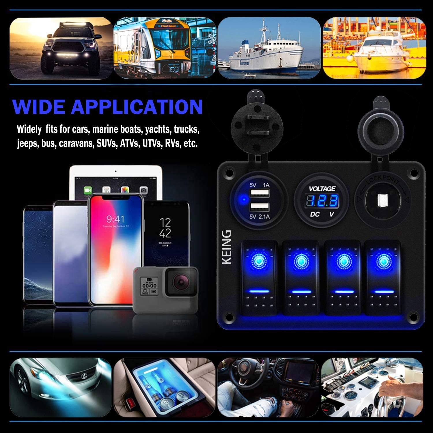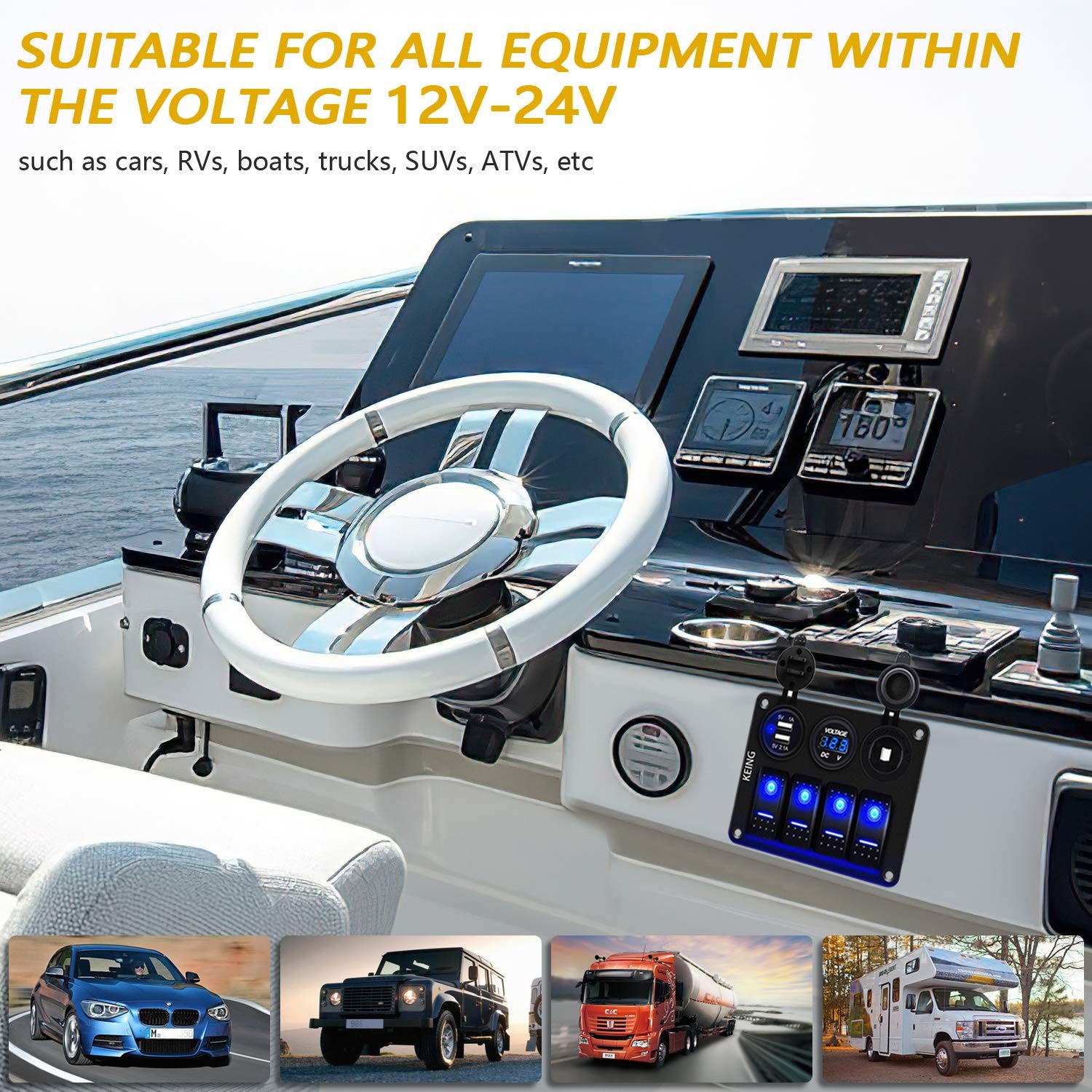 ● 4 Gang Rocker Switch: Safety of use, have output circuit protection, overload protection, reverse polarity protection etc.
