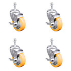 3 Inch SS Yellow Polyurethane Wheel Swivel 10mm Threaded Stem Caster Set Brake