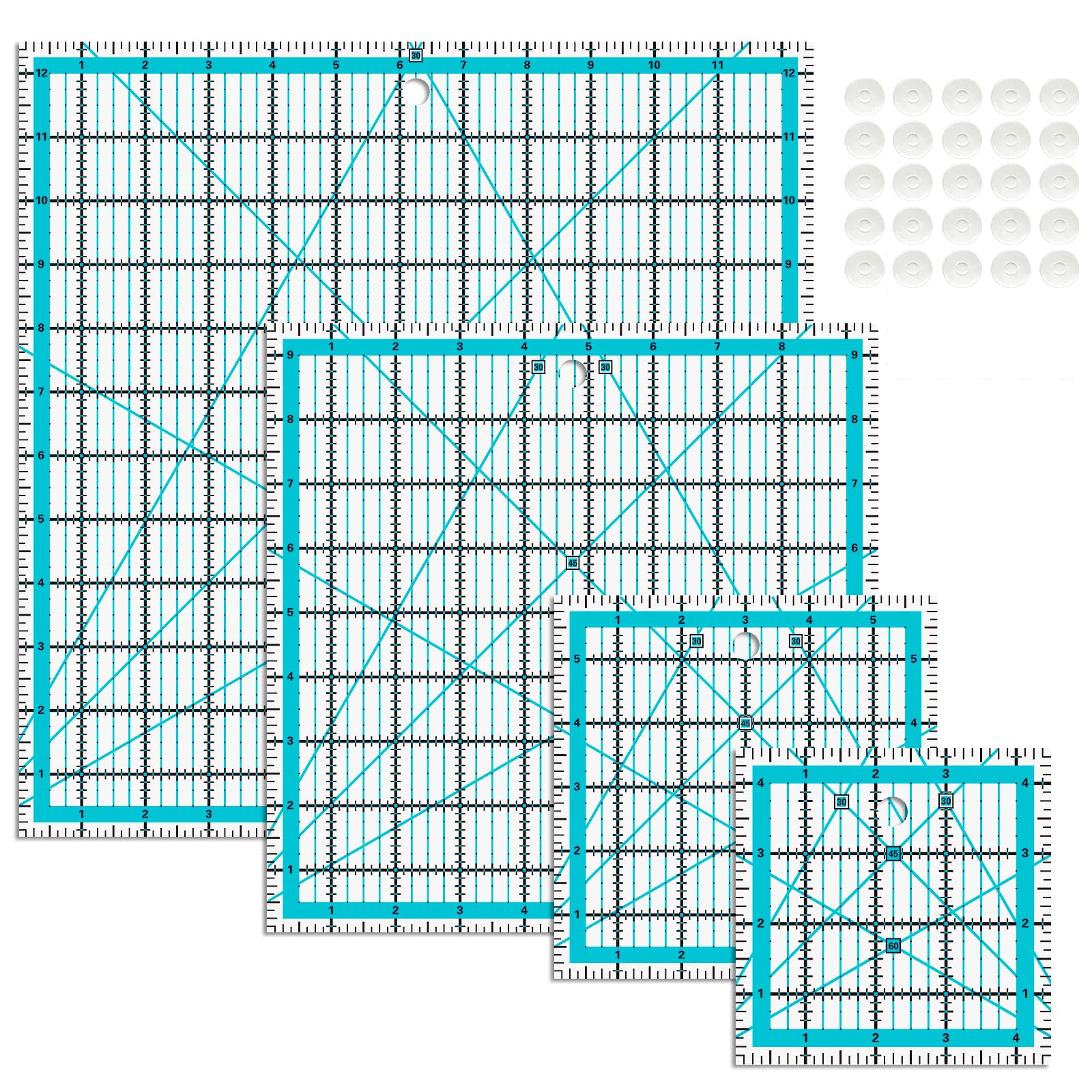 - This quilting ruler set includes 4 square rulers,50 Pieces Non-slip Rings, quilting patchwork ruler set can meet all your patchwork needs, non-slip grip rings to prevent sliding as you cut.