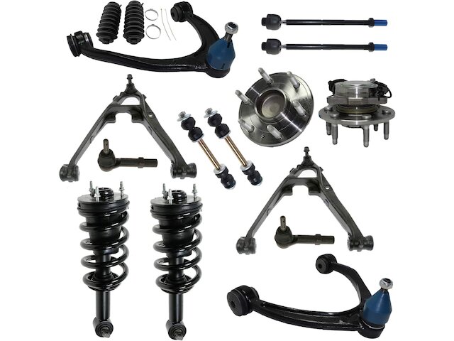 Features:- Kit Includes: (4) Front Upper & Lower Control Arm w/Ball Joint + (2) Front Strut w/ Spring + (4) Front Inner & Outer Tie Rod + (2) Front Wheel Bearing Hub + (2) Front Sway Bar + (2) Boot