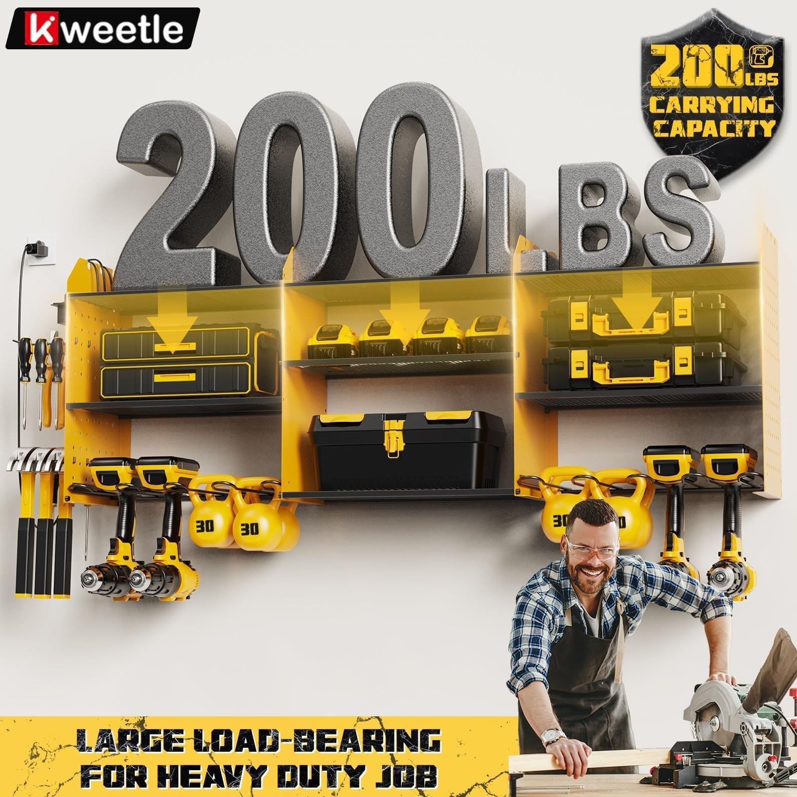 MAXIMUM WEIGHT UP TO 200 LBS The power tool organizer wall mount is crafted with a strong alloy frame and double-layered metal plates, ensuring long-lasting durability and it has a weight capacity of up to 200lbs It serves as a versatile and dependable holder for a wide range of tools and accessories, making it an essential addition to any workspace.
