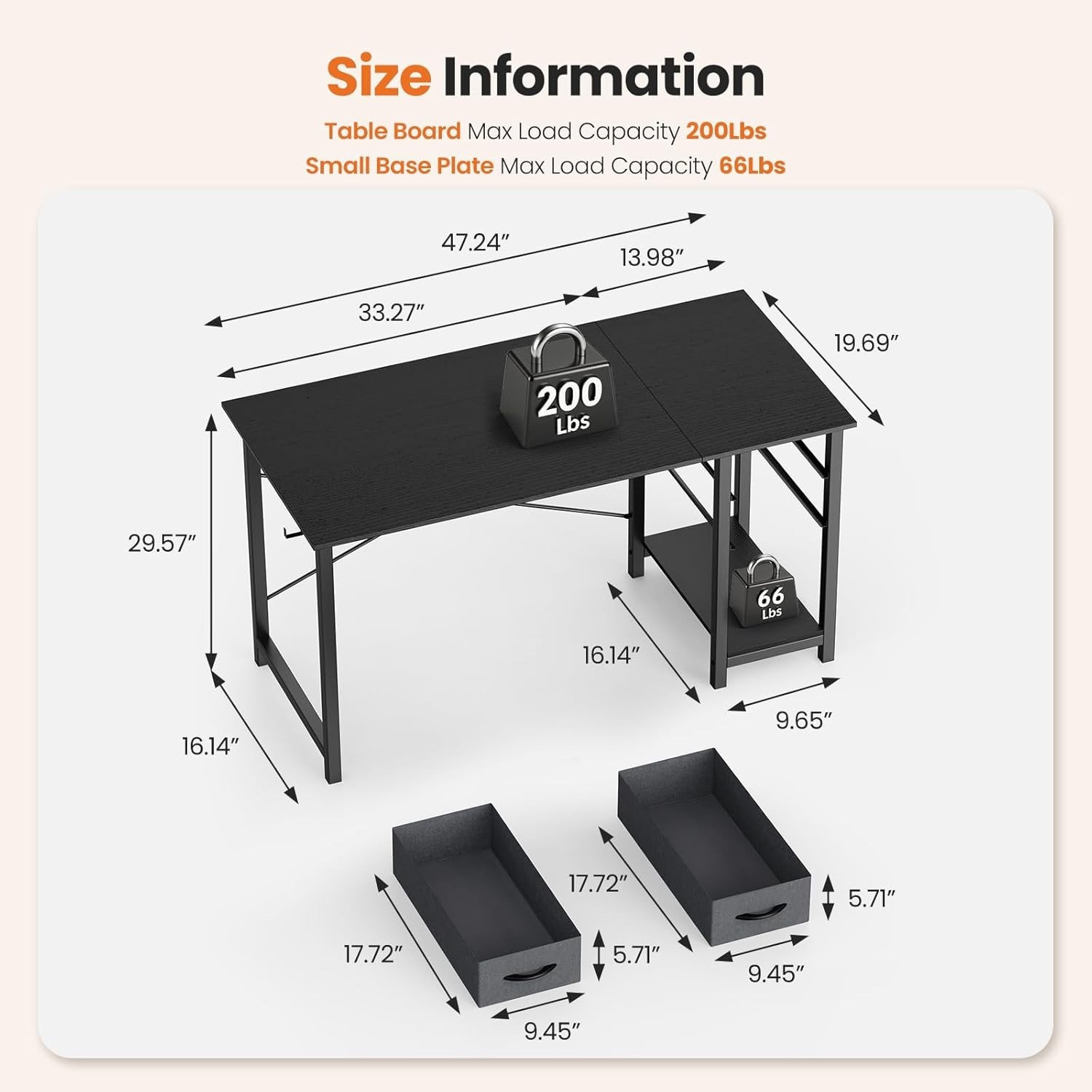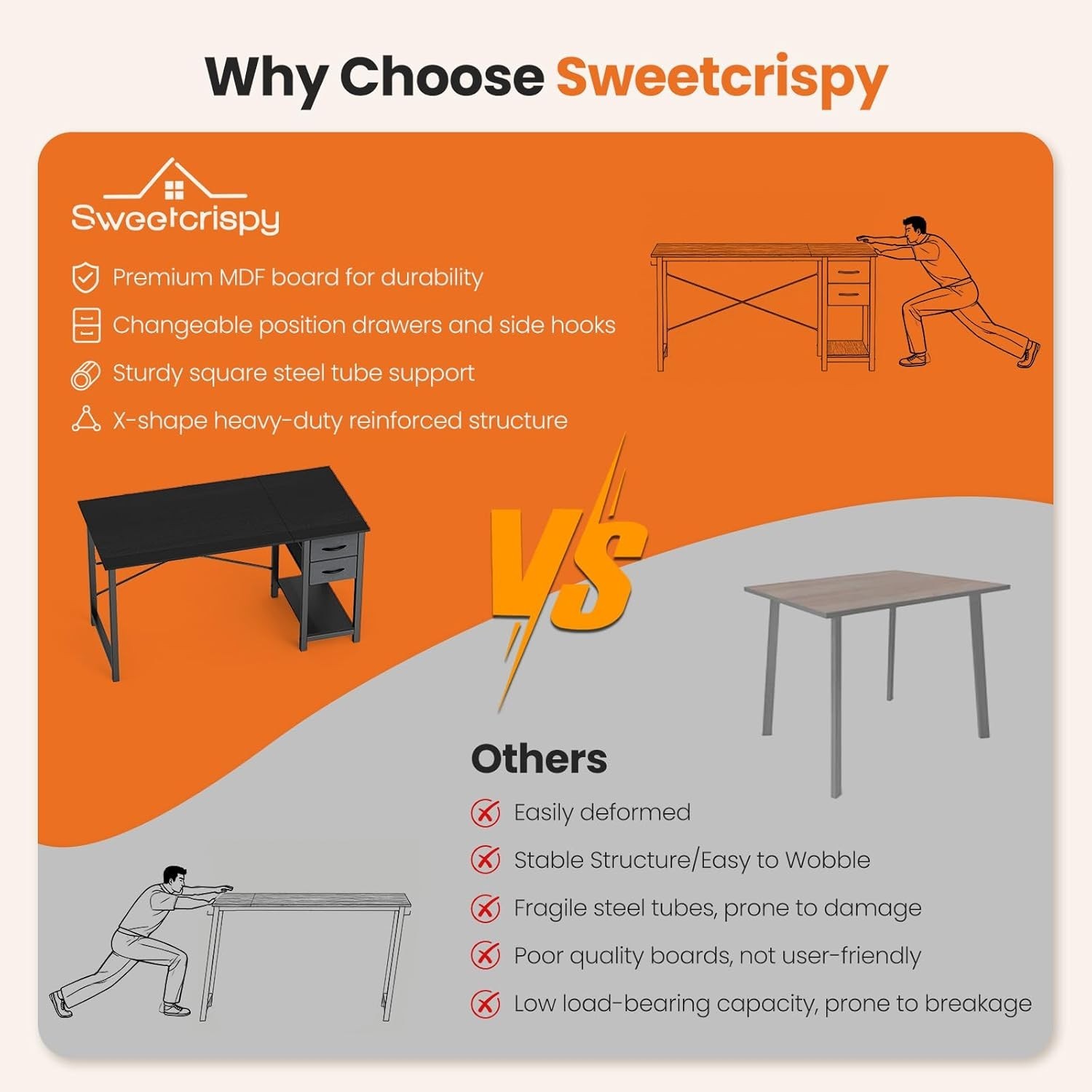 About this item 【Premium Materials】Looking for a computer desk that's both stylish and strong? You're in the right place. use premium MDF and solid steel tubing to make sure this table can easily handle up to 200 lbs. It's built to last—so you can work or play with confidence. 【Sturdy X-Frame Support】Shaky writing desks are a thing of the past. Thanks to our reinforced X-frame base, which adds triangular support where it matters most, this computer desk stays firm and steady. No more wobbles—just solid performance. 【Flexible Drawer Setup】Your desk, your rules. Feel free to attach the drawer on the left or right—or take it off completely when you want more room. We designed it to adapt to your life. 【Handy Side Hooks】Keep your things tidy and within arm's reach. These little hooks on the side are perfect for hanging headphones, your favorite bag, or an organizer pouch. A clutter-free space helps you stay focused. 【Easy Assembly】We get it—nobody likes complicated setup. That's why everything you need is in the box: parts, tools, and a clear manual. Prefer watching over reading? Click the link to see how it's done. We'll have you set up in no time.