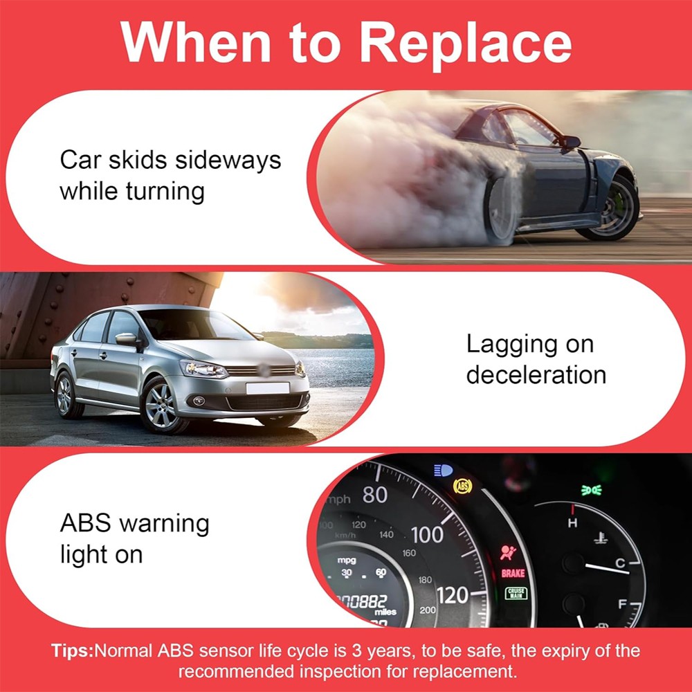 When your sensor fails to light the ABS warning light or the failure indicator light, it may lead to the failure of the anti-lock brake, the system can not work safely and normally, and the car loses traction or stability control. At this time, you need to replace the abs sensor.