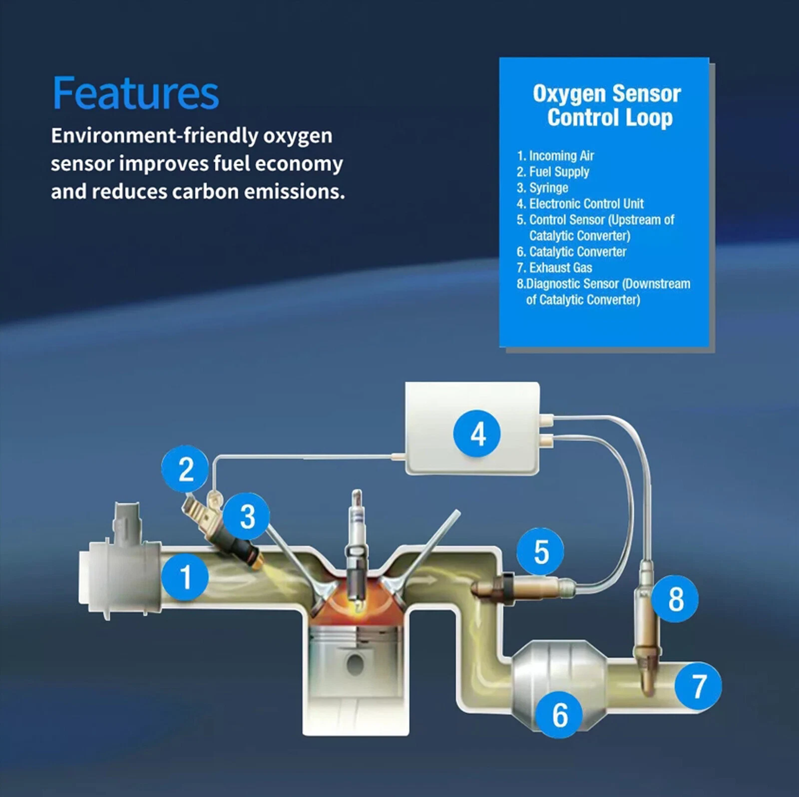Corrosion-resistant stainless steel construction PTFE filter blocks efficiency-robbing contaminants Refined zirconia element improves sensor response Superior design maximizes engine performance and fuel efficiency while reducing fuel consumption and harmful emissions Ensures smog test compliance Ready to use, Direct Replacement Built to strict quality control standards 100% Factory tested