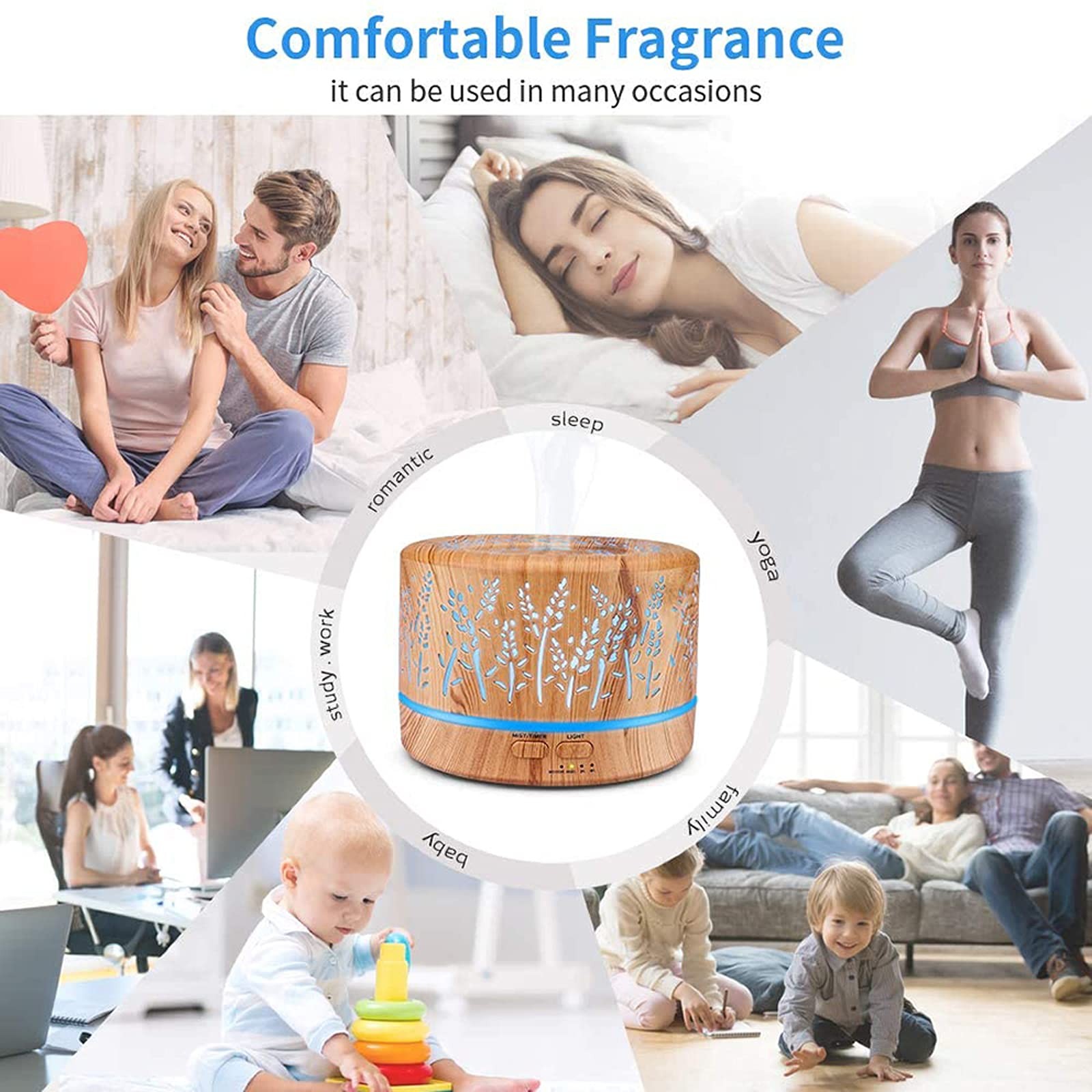 This ultrasonic essential oil diffuser has a large, easy-to-clean 500ml water tank.this is great for large rooms and working time can up to 14 hours.This humidifier will automatically shut off when water runs out. Use it to improve your home's air and atmosphere quality.