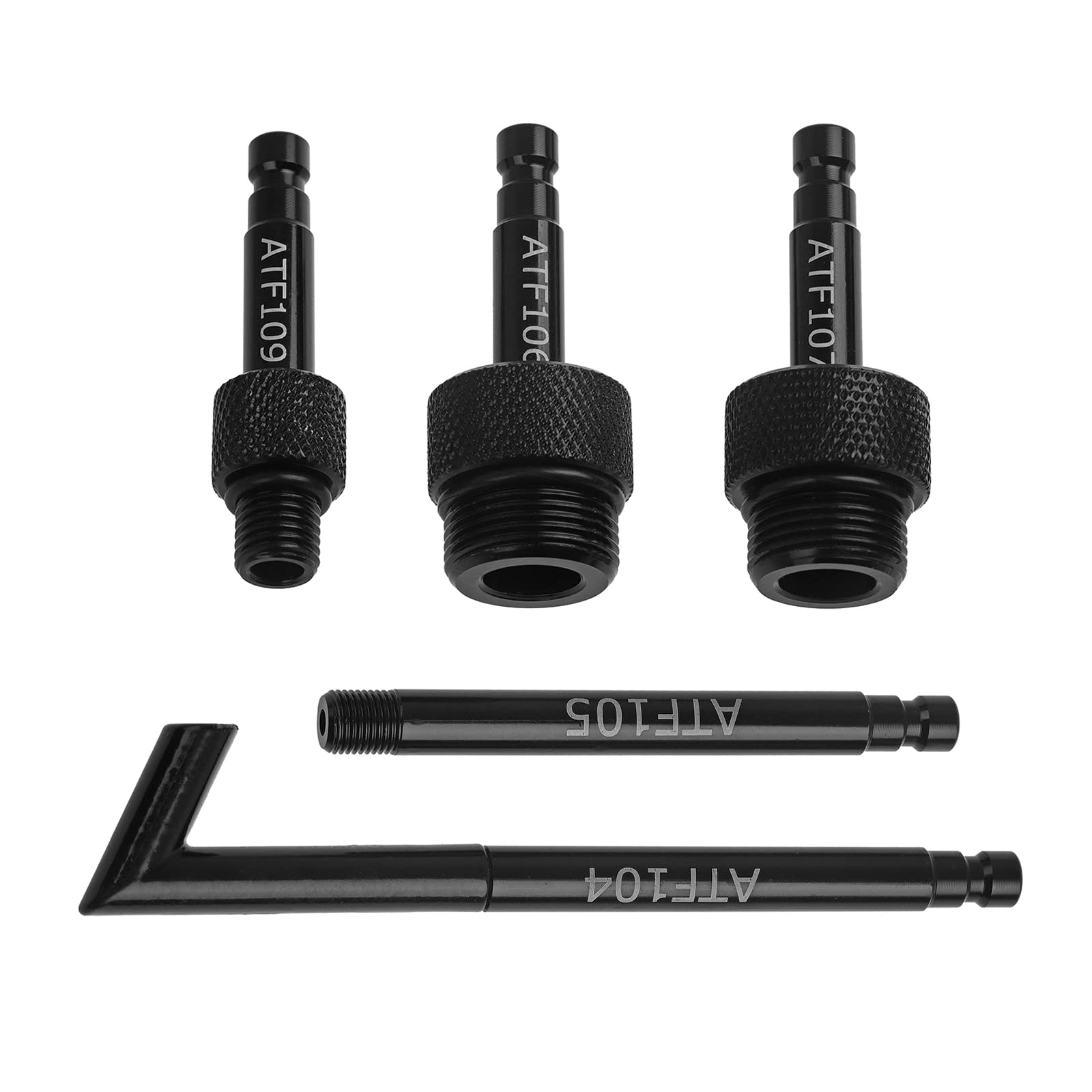 These 5Pcs ATF filler adapters are dependable replacement parts that perfectly match the fit and function of the original factory parts on the models VAS6262-1, VAS6262-2, VAG1924/1, VAS5162-1, 722.9.Specification:Item Type: ATF Filler AdaptersMaterial: Aluminum AlloyColor: BlackPart Number and Compatibility:Adapter ATF106: Part Number: VAS6262-1, thread M24 x 1.5, Fit for Audi DSG TransmissionAdapter ATF105: Part Number: VAS6262-2, thread M10 x 1.0, Fit for Audi AISIN 09G TransmissionAdapter ATF104: Part Number: VAG1924/1, bended angle 60 degree, Fit for VW Audi 01J TransmissionAdapter ATF107: Part Number: VAS5162-1, thread M22 x 1.5, Fit for Audi CVT TransmissionAdapter ATF109: Part Number: 722.9, thread M12 x 1.5, Fit for Mercedes Benz TransmissionPackage List:5Pcs x ATF Filler Adapter