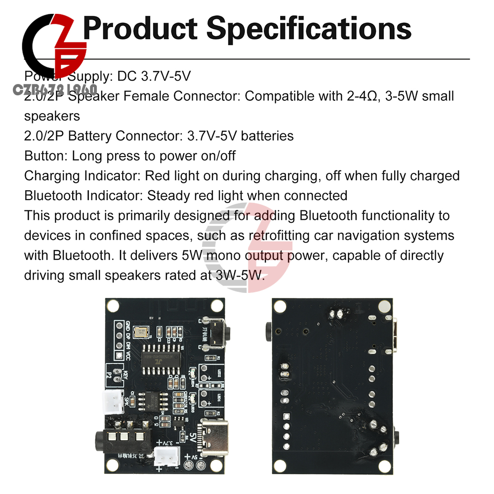 This product is primarily designed to add Bluetooth functionality to devices in confined spaces, such as retrofitting Bluetooth into car navigation systems. It outputs 5W mono power, capable of directly driving small speakers rated at 3W-5W.