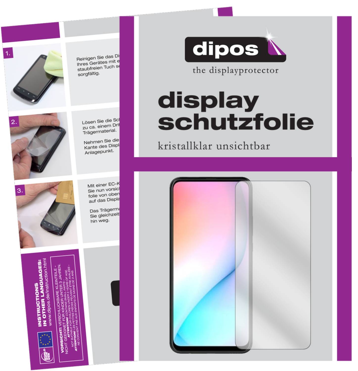 Modern silicone adhesion ensures that the film attaches itself to the display and can be applied without forming bubbles. Small bubbles can be easily pushed to the edge. Adhesion is achieved completely without glue, which means the dipos film can be removed even years later without leaving residues behind and without slipping during use.